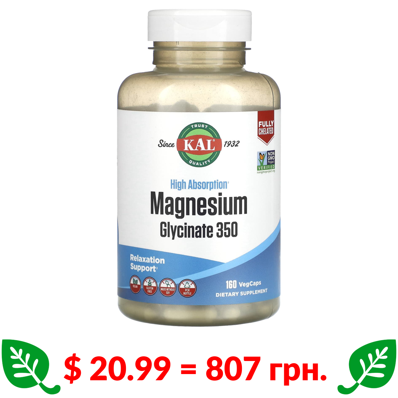 $ 20.99 = 807 грн. КАЛ, Глицинат магния с высокой абсорбцией 350, 160 вегетарианских капсул