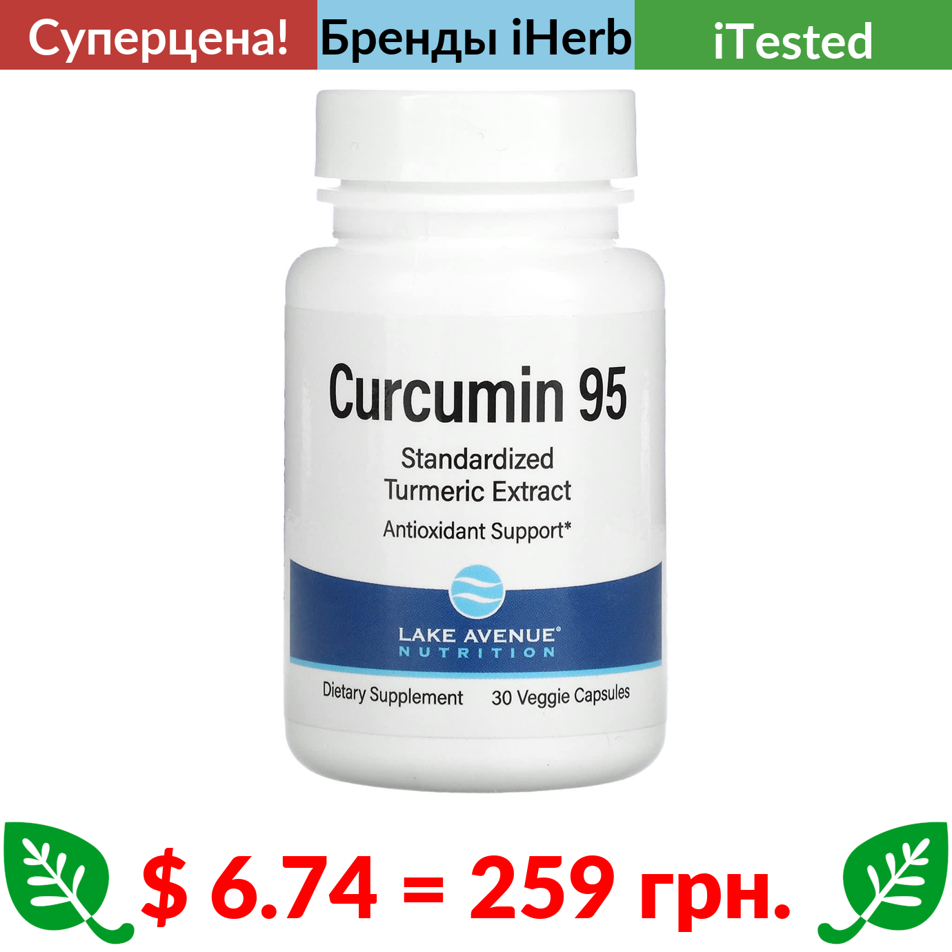 $ 6.74 = 259 грн. ???? cуперакція! ???? Lake Avenue Nutrition, куркумин 95, 500 мг, 30 вегетарианских капсул