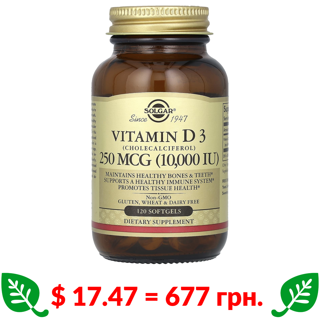 $ 17.47 = 677 грн. Солгар, витамин D3 (холекальциферол), 250 мкг (10 000 МЕ), 120 капсул
