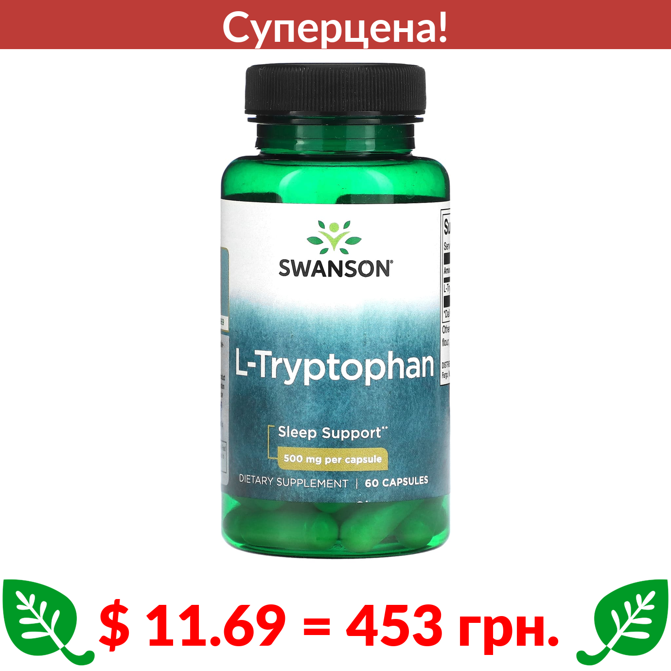 $ 11.69 = 453 грн. ???? cуперакція! ???? Swanson, L-триптофан, 500 мг, 60 капсул