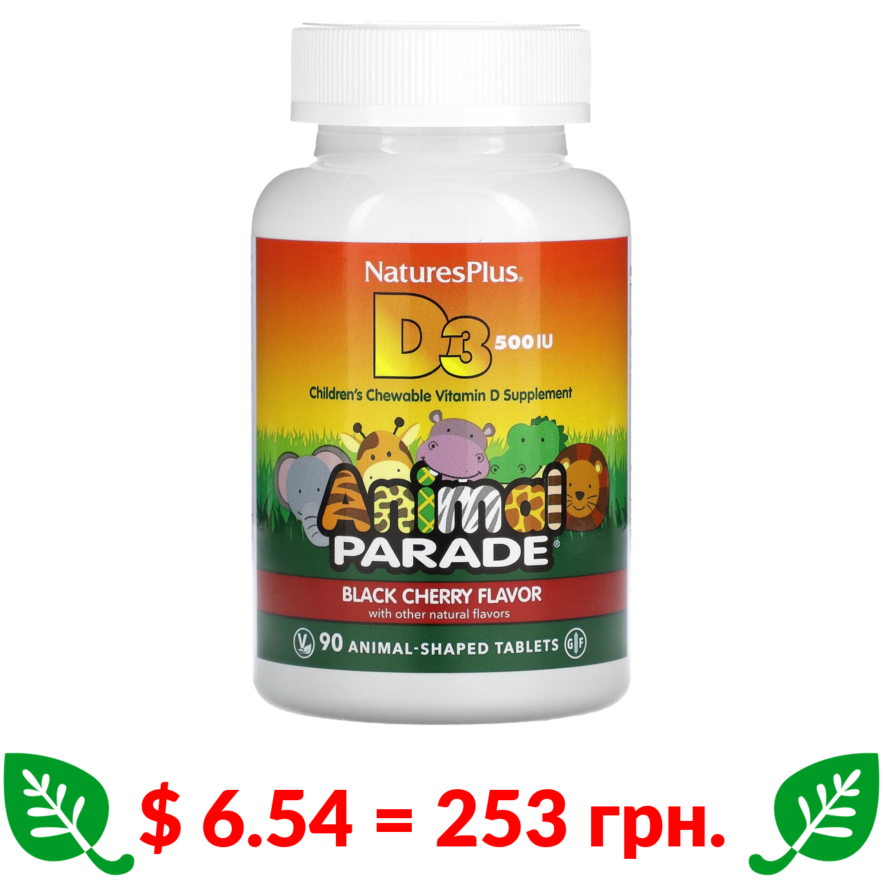 $ 6.54 = 253 грн. ????️ у кошику ????️ NaturesPlus, Source of Life, Animal Parade, витамин D3, со вкусом натуральной черешни, 500 МЕ, 90 таблеток в форме животных