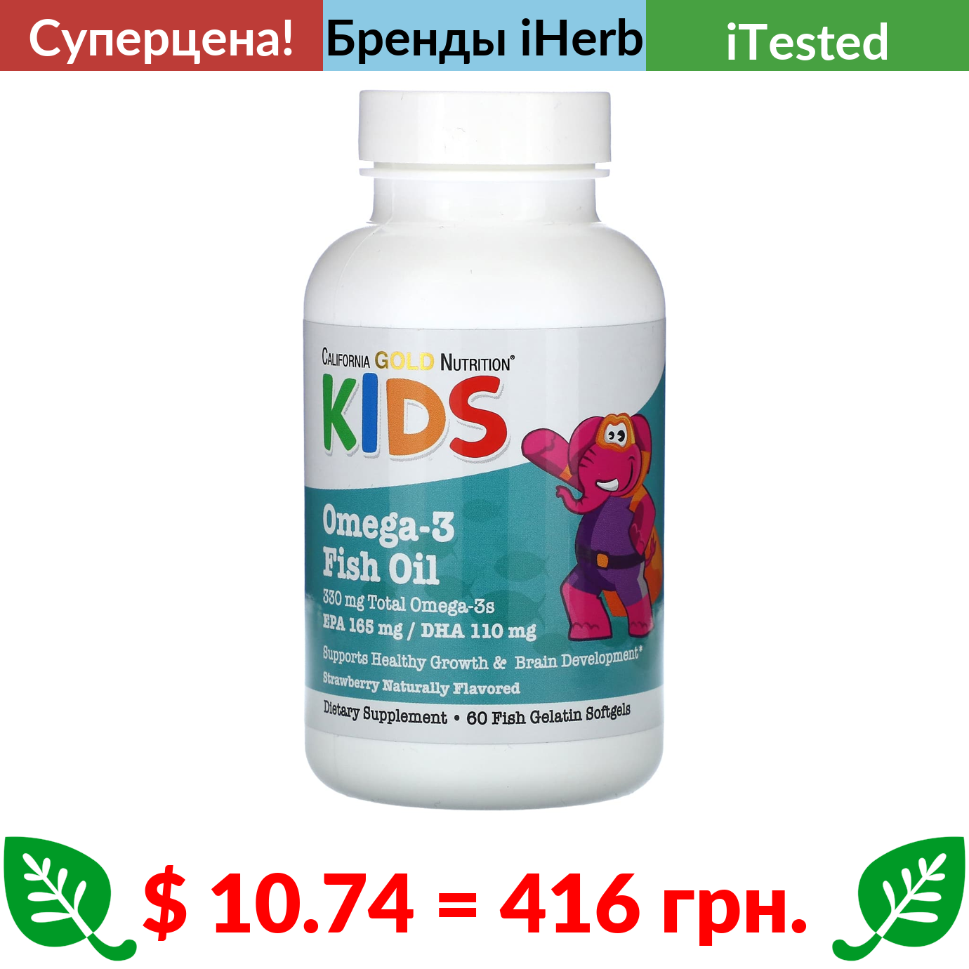 $ 10.74 = 416 грн. ???? cуперакція! ???? California Gold Nutrition, рыбий жир с омега-3 для детей, натуральный клубничный вкус, 60 капсул из рыбьего желатина