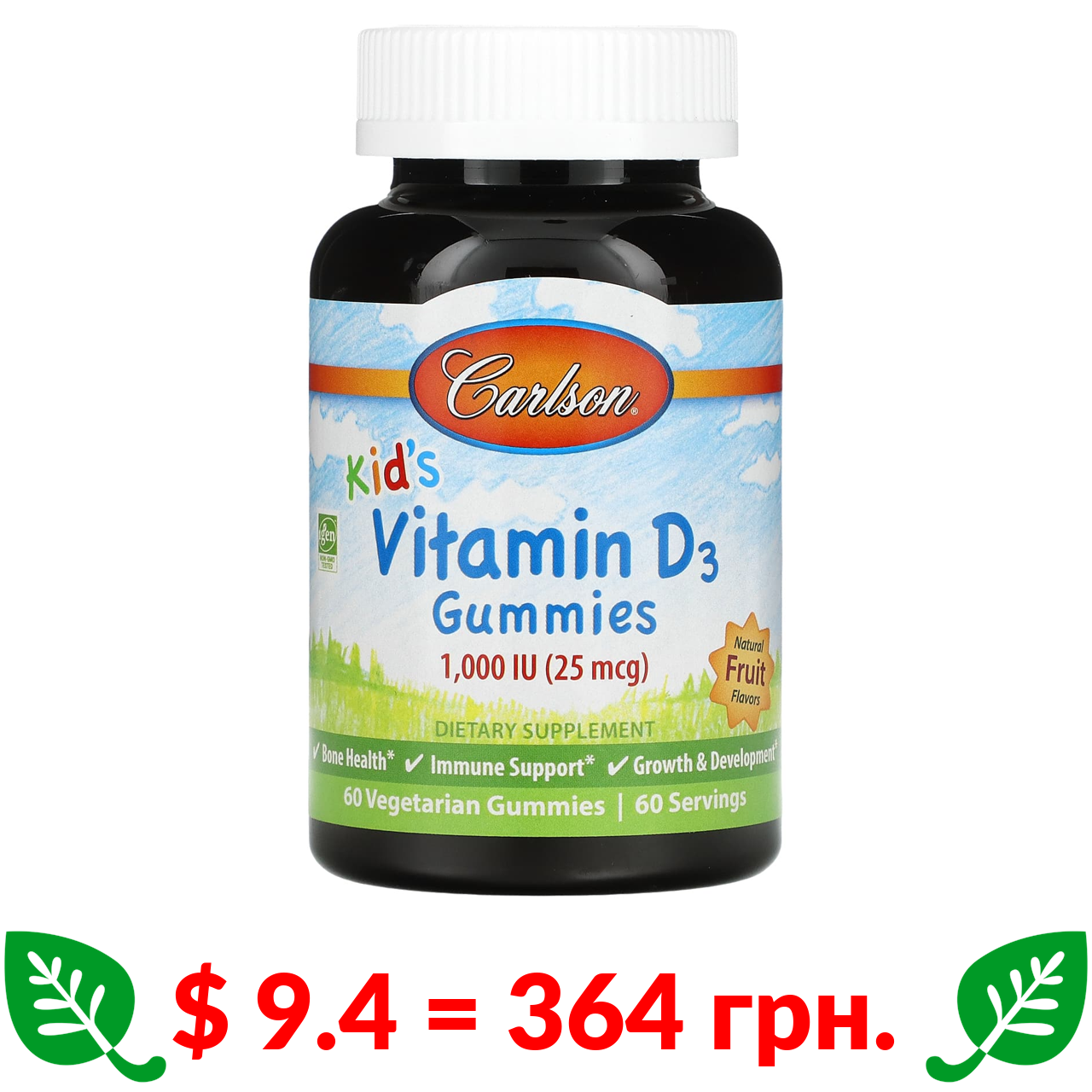 $ 9.4 = 364 грн. ????️ у кошику ????️ Carlson, Детские жевательные таблетки с витамином D3, натуральные фруктовые ароматизаторы, 25 мкг (1000 МЕ), 60 шт.