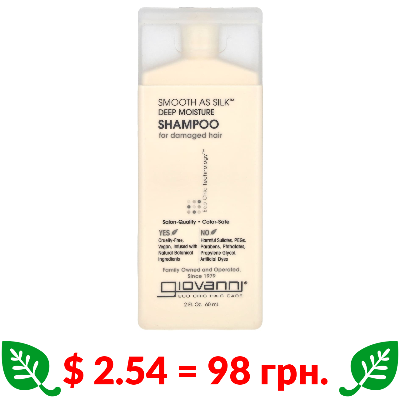 $ 2.54 = 98 грн. Джиованни, Smooth As Silk, шампунь для интенсивного увлажнения, для поврежденных волос, 60 мл (2 жидк. унции)