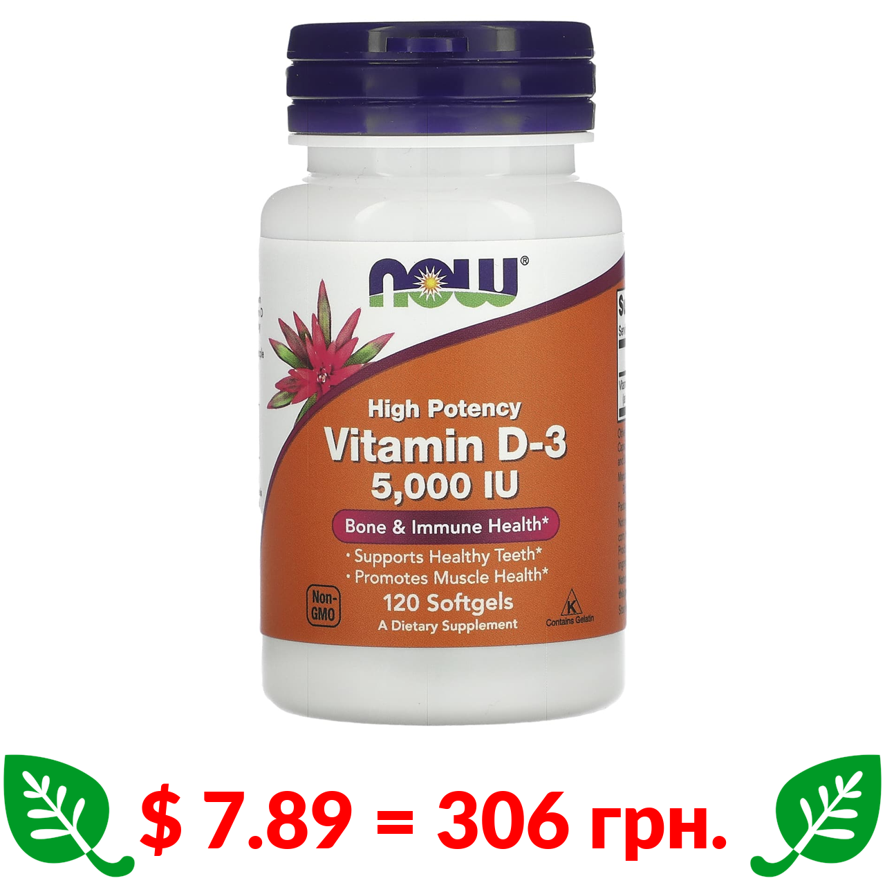 $ 7.89 = 306 грн. ????️ у кошику ????️ Now Foods, витамин D3, высокоактивный, 5000 МЕ, 120 капсул