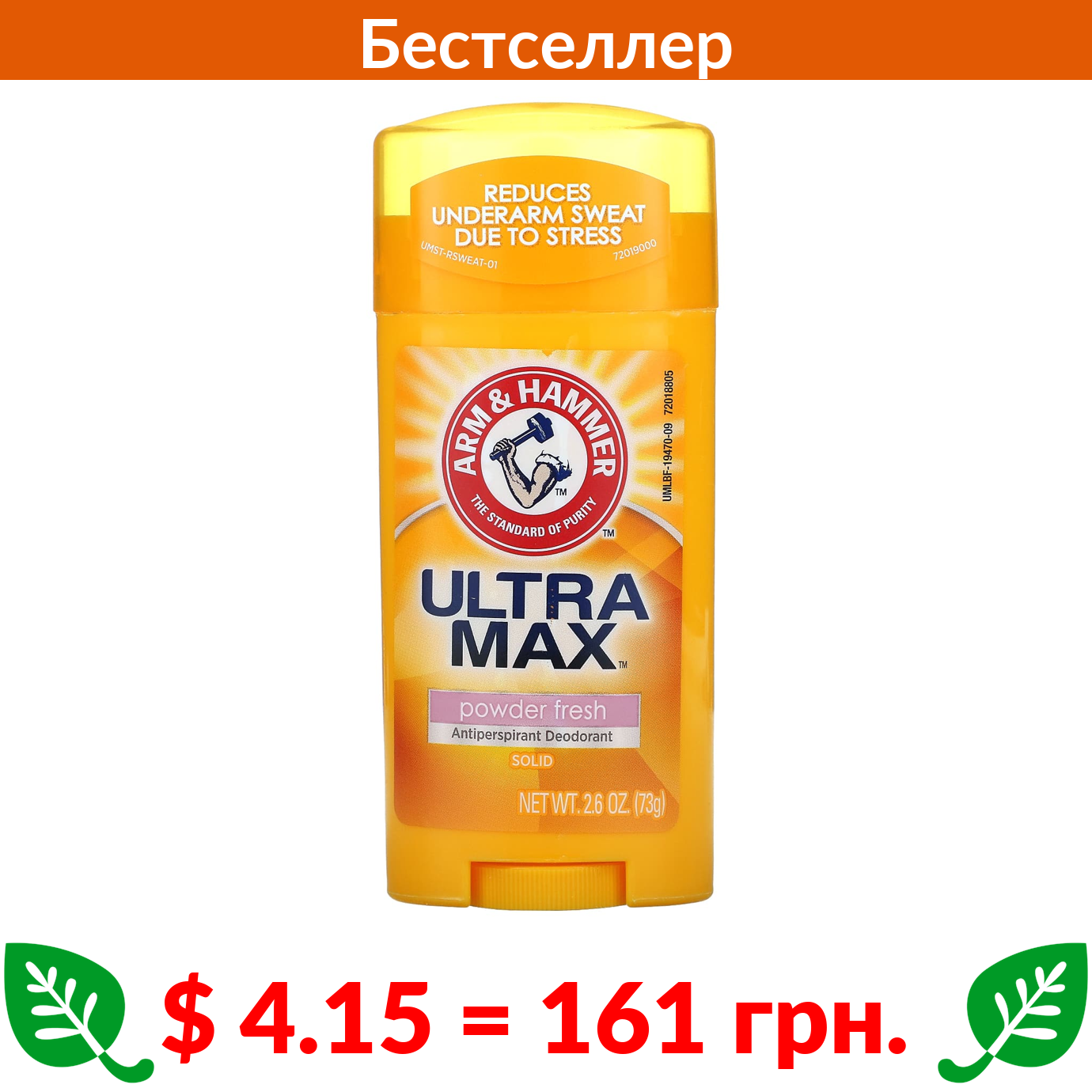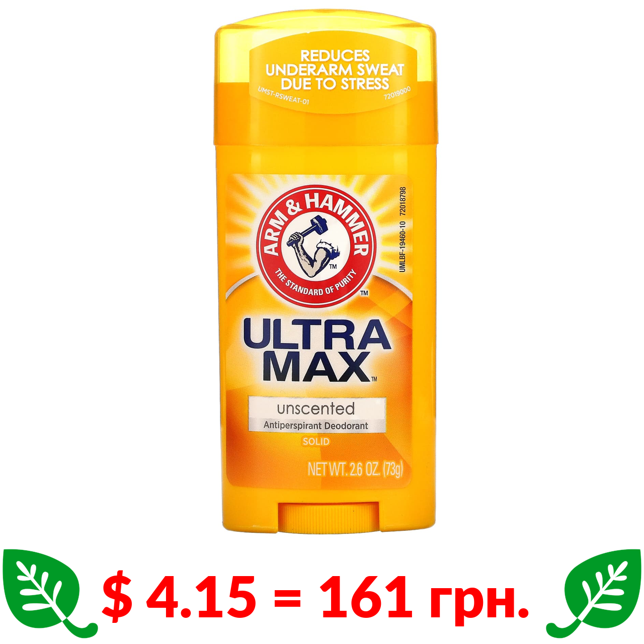 $ 4.15 = 161 грн. Арм энд Хаммер, UltraMax, твердый дезодорант-антиперспирант, без запаха, 73 г (2,6 унции)