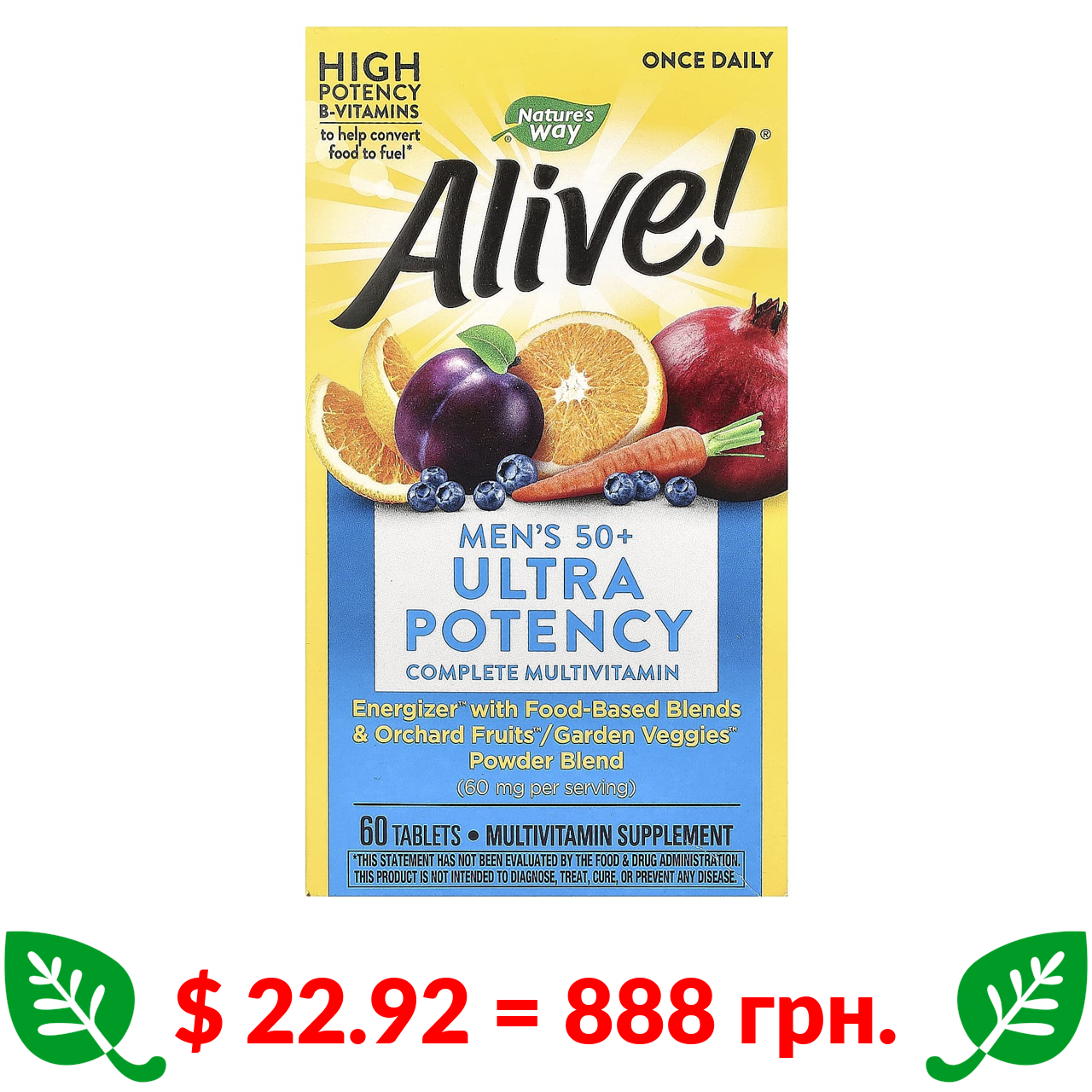 $ 22.92 = 888 грн. Натурес Вэй, Alive! комплекс суперэффективных мультивитаминов для мужчин 50+, 60 таблеток