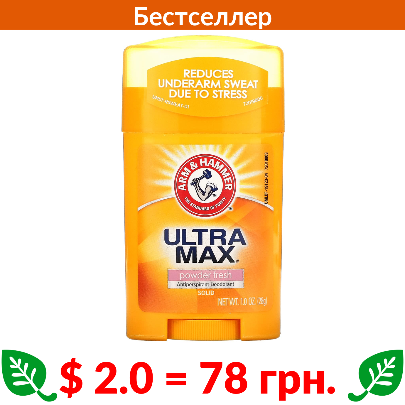 $ 2.0 = 78 грн. Арм энд Хаммер, UltraMax, твердый дезодорант-антиперспирант для мужчин, свежий аромат, 28 г (1 унции)