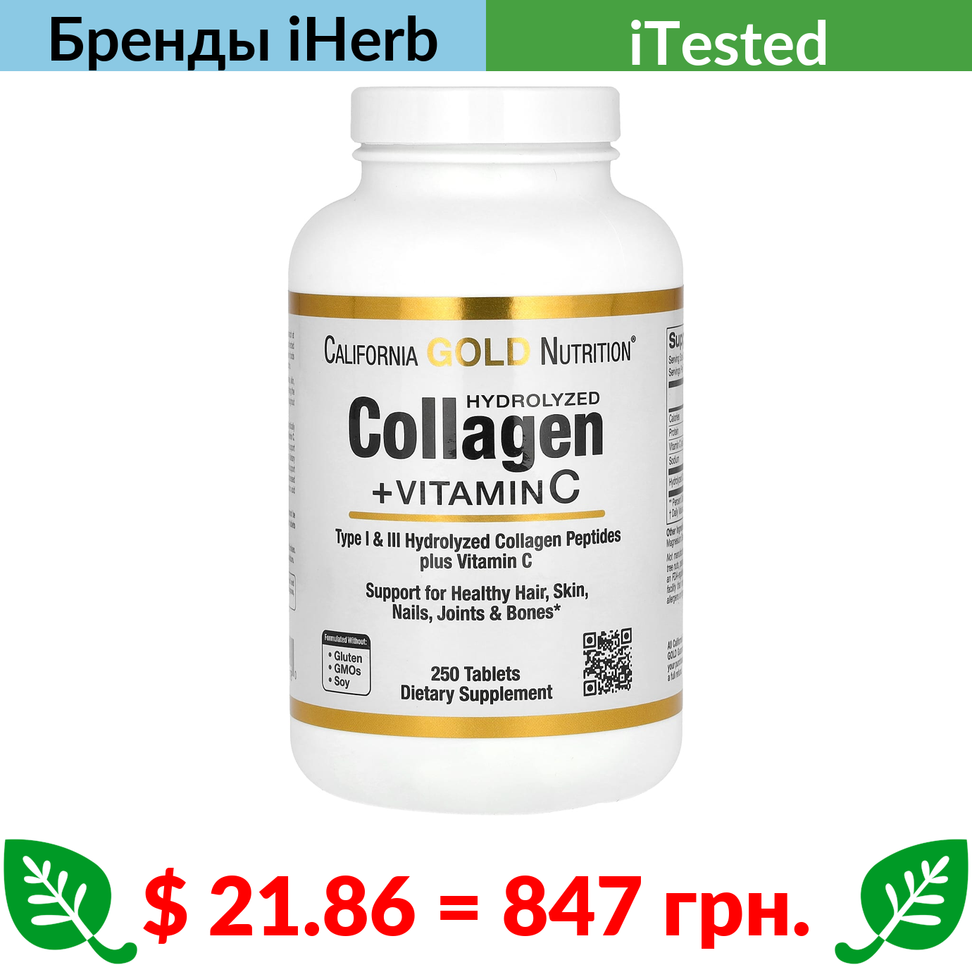 $ 21.86 = 847 грн. California Gold Nutrition, пептиды гидролизованного коллагена с витамином C, тип 1 и 3, 250 таблеток