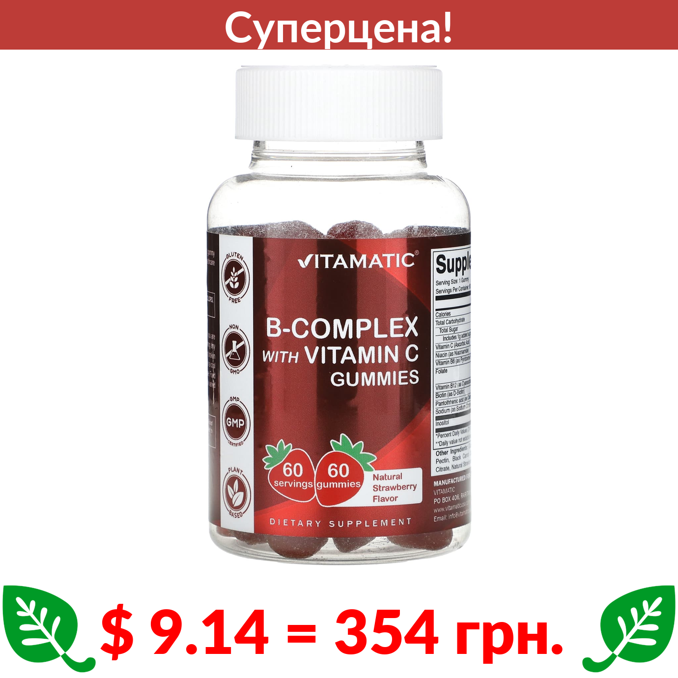 $ 9.14 = 354 грн. ???? cуперакція! ???? Vitamatic, Комплекс витаминов группы B с витамином C, жевательные мармеладки, клубника, 60 жевательных таблеток