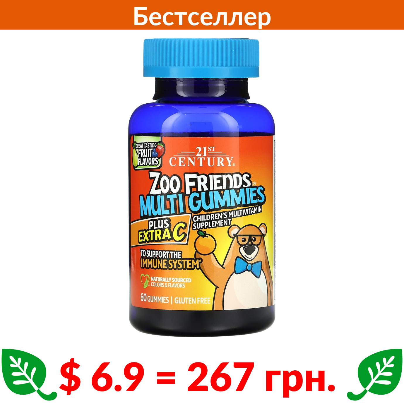 $ 6.9 = 267 грн. 21st Century, Zoo Friends, мультивитаминные жевательные мармеладки, плюс дополнительный витамин C, фрукты с отличным вкусом, 60 жевательных таблеток
