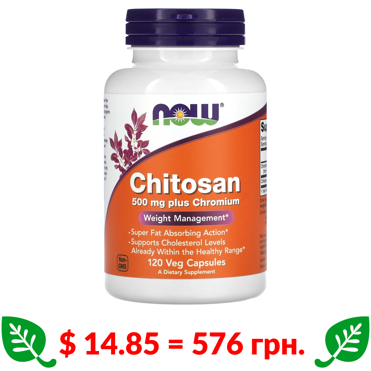 $ 14.85 = 576 грн. Now Foods, хитозан с хромом, 500 мг, 120 вегетарианских капсул