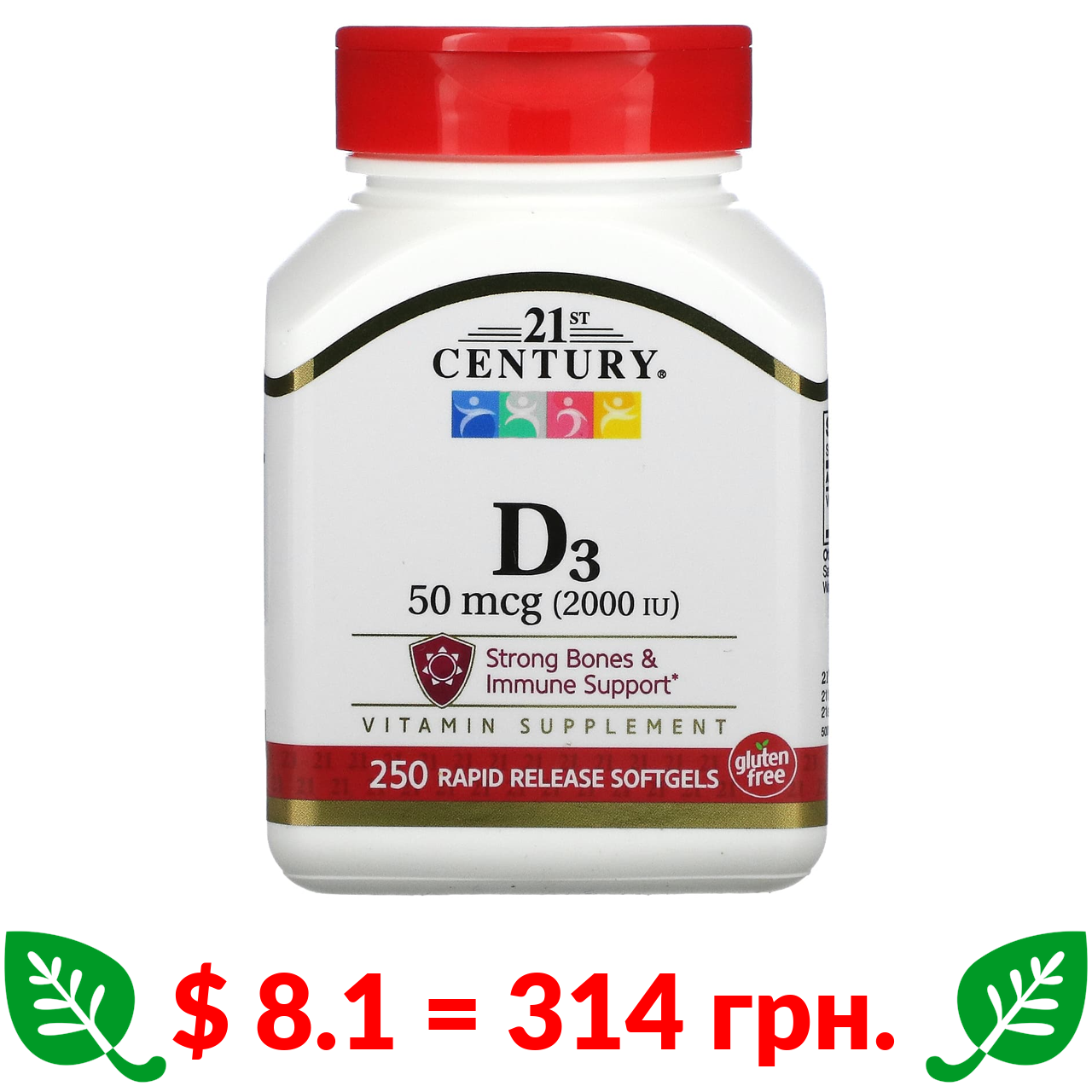 $ 8.1 = 314 грн. ????️ у кошику ????️ 21st Century, витамин D3, 50 мкг (2000 МЕ), 250 мягких таблеток