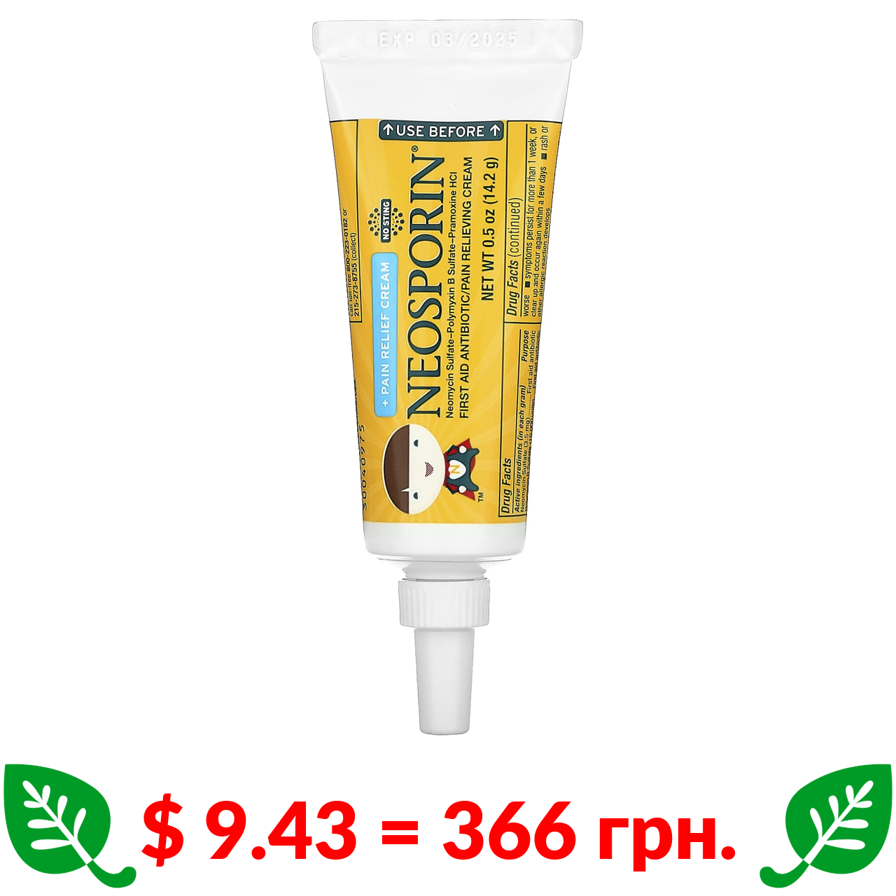 $ 9.43 = 366 грн. Неоспорин, + обезболивающий крем, для детей от 2 лет, 14,2 г (0,5 унции)