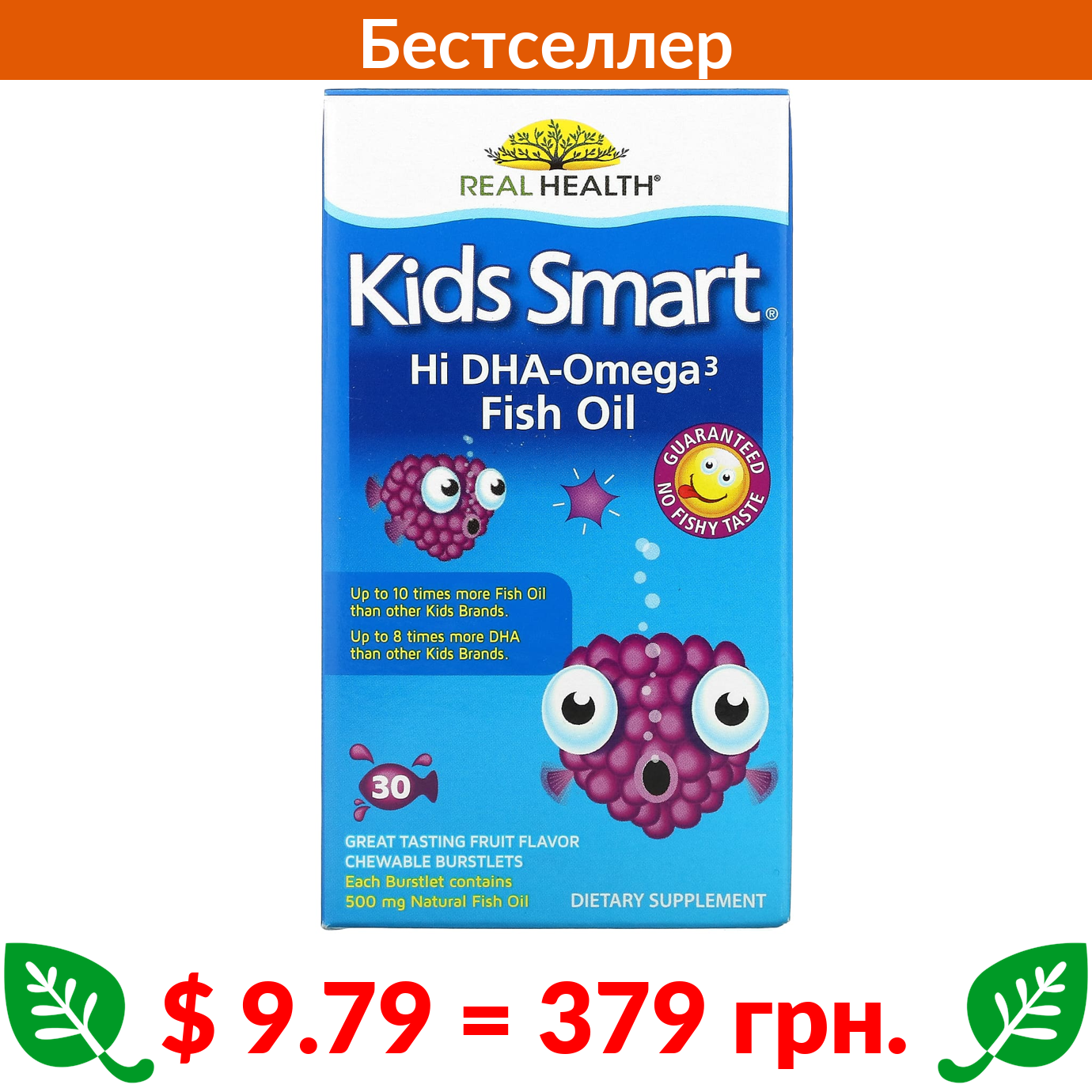 $ 9.79 = 379 грн. Байоглэн, Kids Smart, рыбий жир с высоким содержанием омега-3 и ДГК, великолепный фруктовый вкус, 30 жевательных капсул, лопающихся во рту