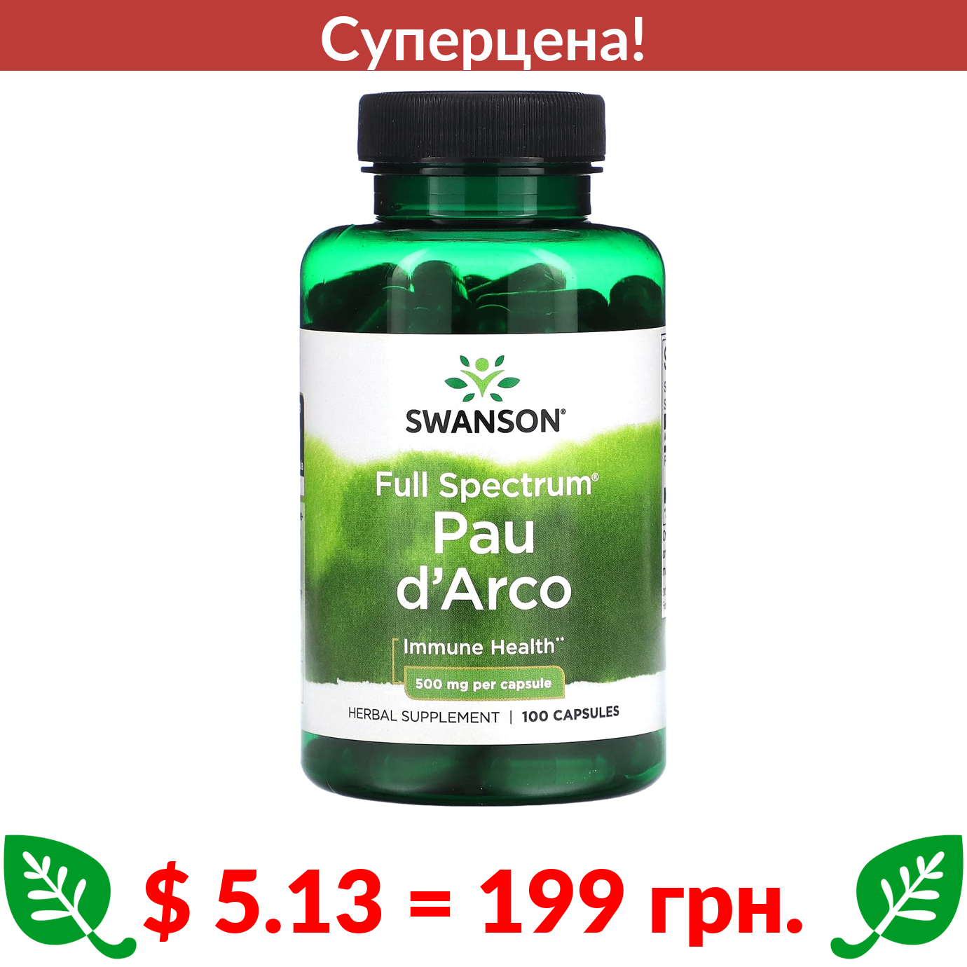 $ 5.13 = 199 грн. ???? cуперакція! ???? Swanson, Муравьиное дерево полного спектра, 500 мг, 100 капсул