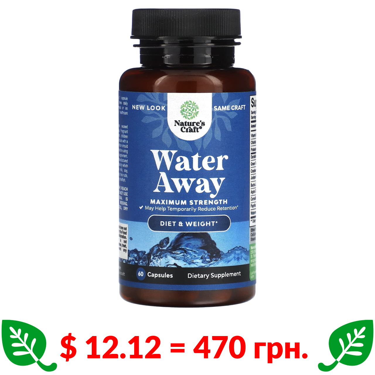 $ 12.12 = 470 грн. Natures Craft, Water Away, максимальная эффективность, 60 капсул