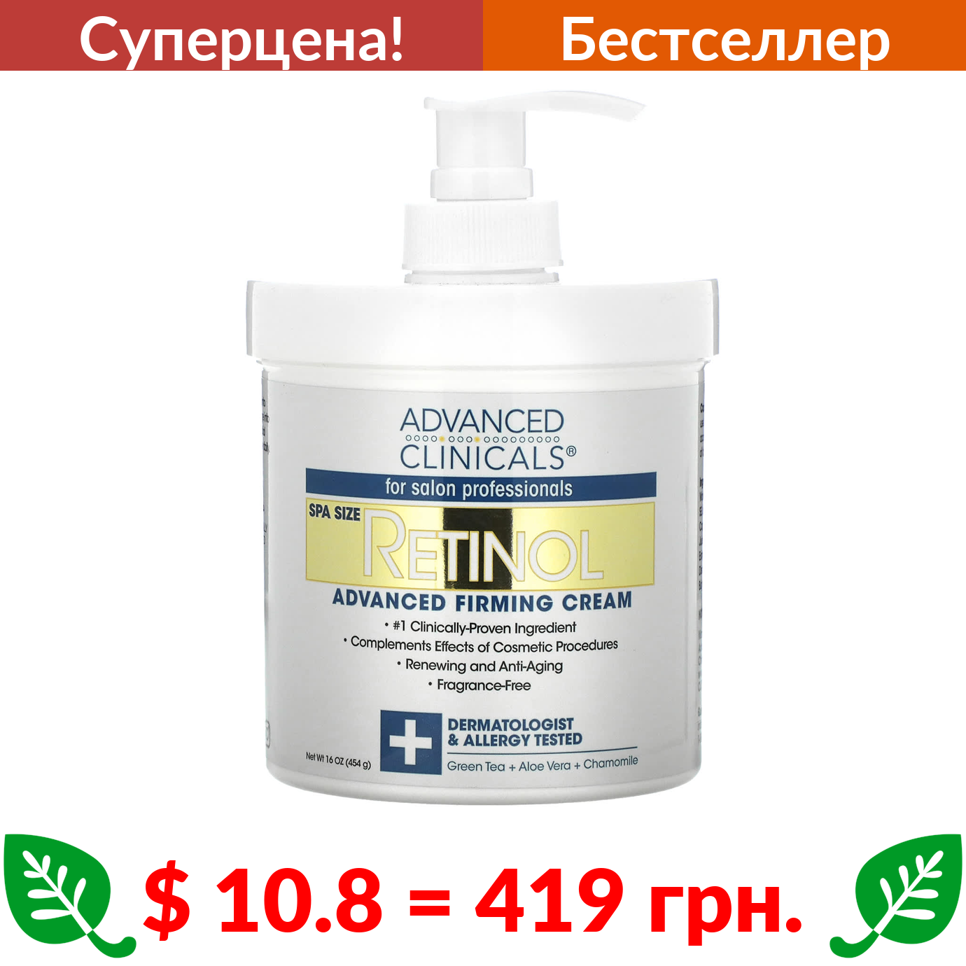 $ 10.8 = 419 грн. ???? cуперакція! ???? Advanced Clinicals, Retinol, укрепляющий крем с улучшенной формулой, 454 г (16 унций)
