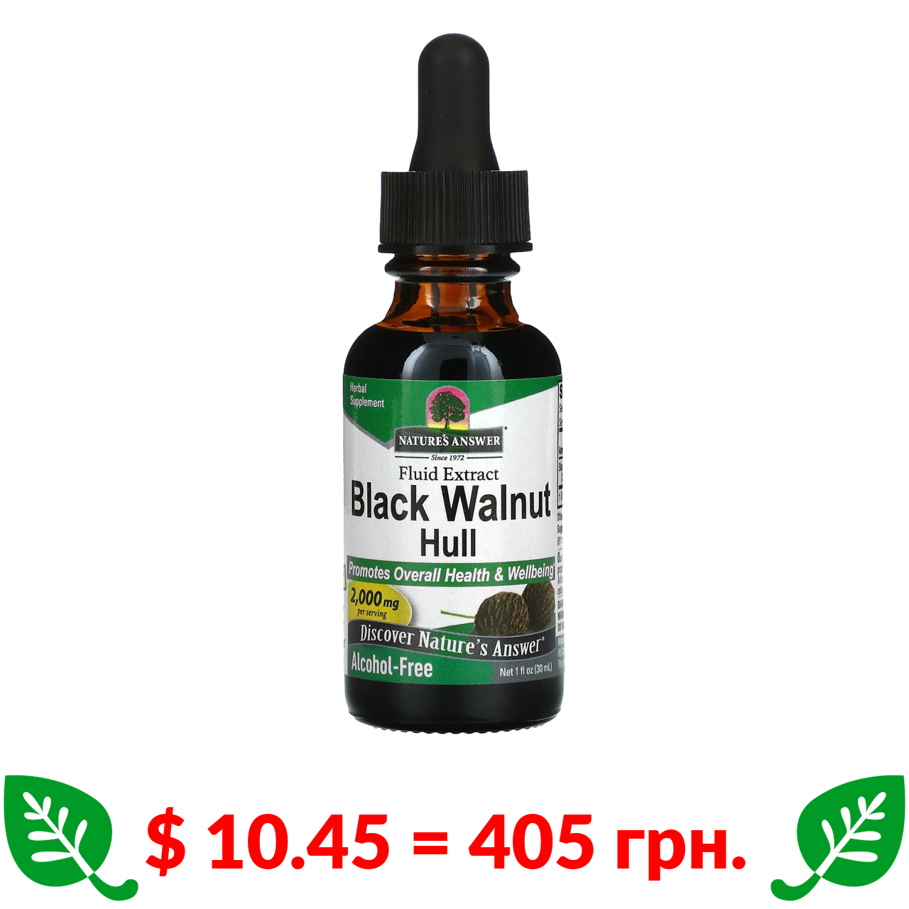 $ 10.45 = 405 грн. Nature’s Answer, скорлупа черного ореха, жидкий экстракт, без спирта, 2000 мг, 30 мл (1 жидк. унция)