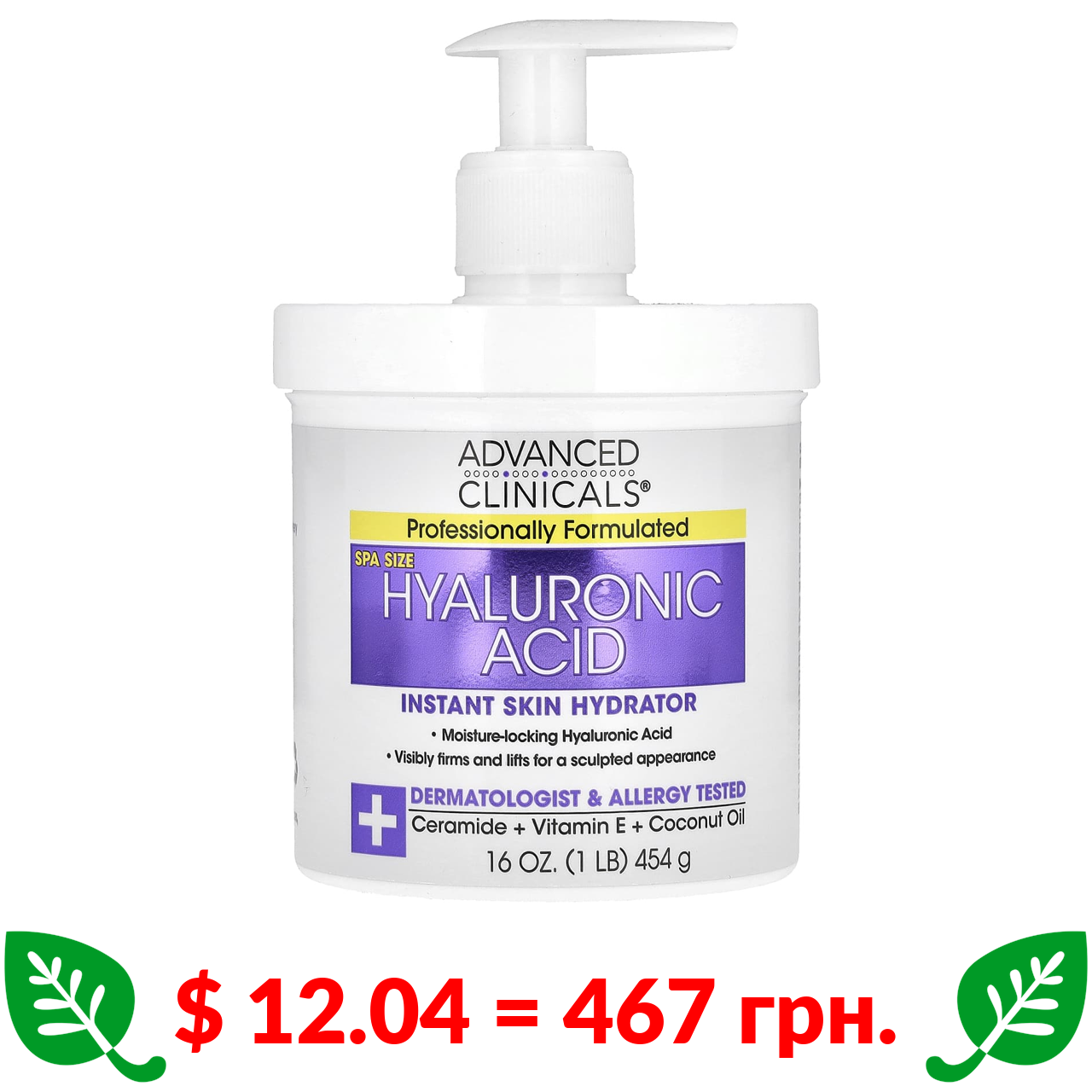 $ 12.04 = 467 грн. Advanced Clinicals, гиалуроновая кислота, мгновенное увлажнение кожи, 454 г (1 фунт / 16 унций)