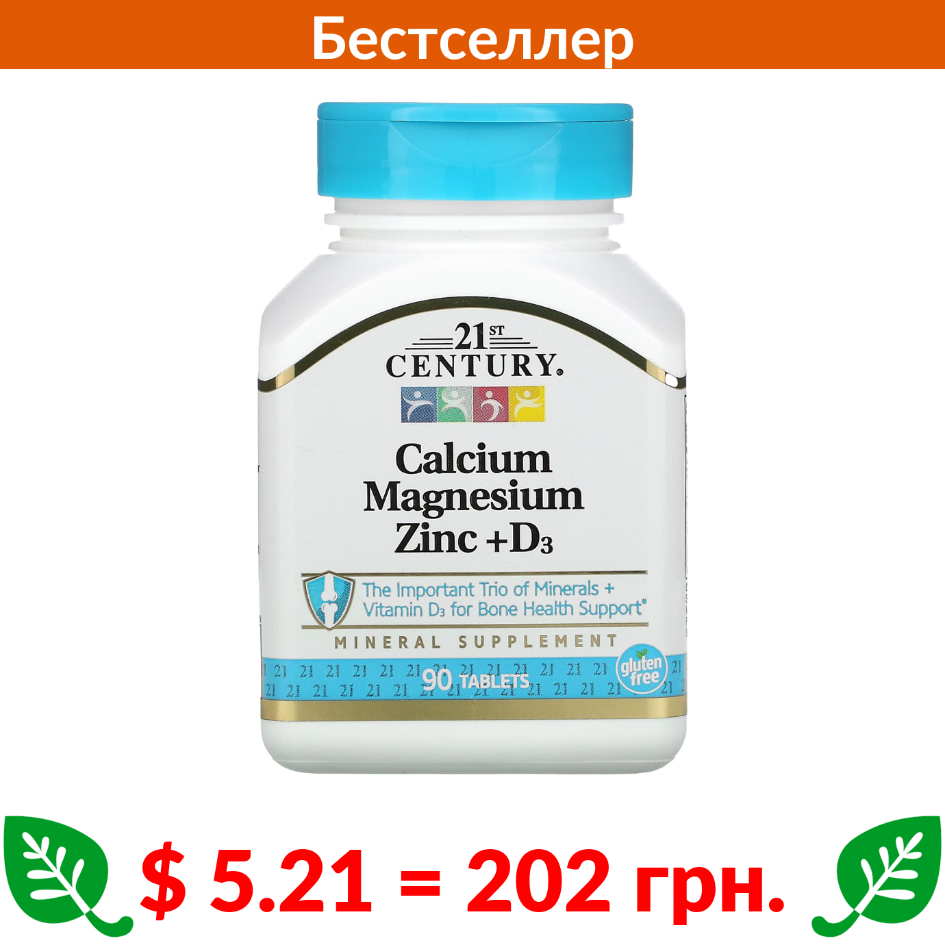 $ 5.21 = 202 грн. 21st Century, кальций, магний, цинк и витамин D3, 90 таблеток