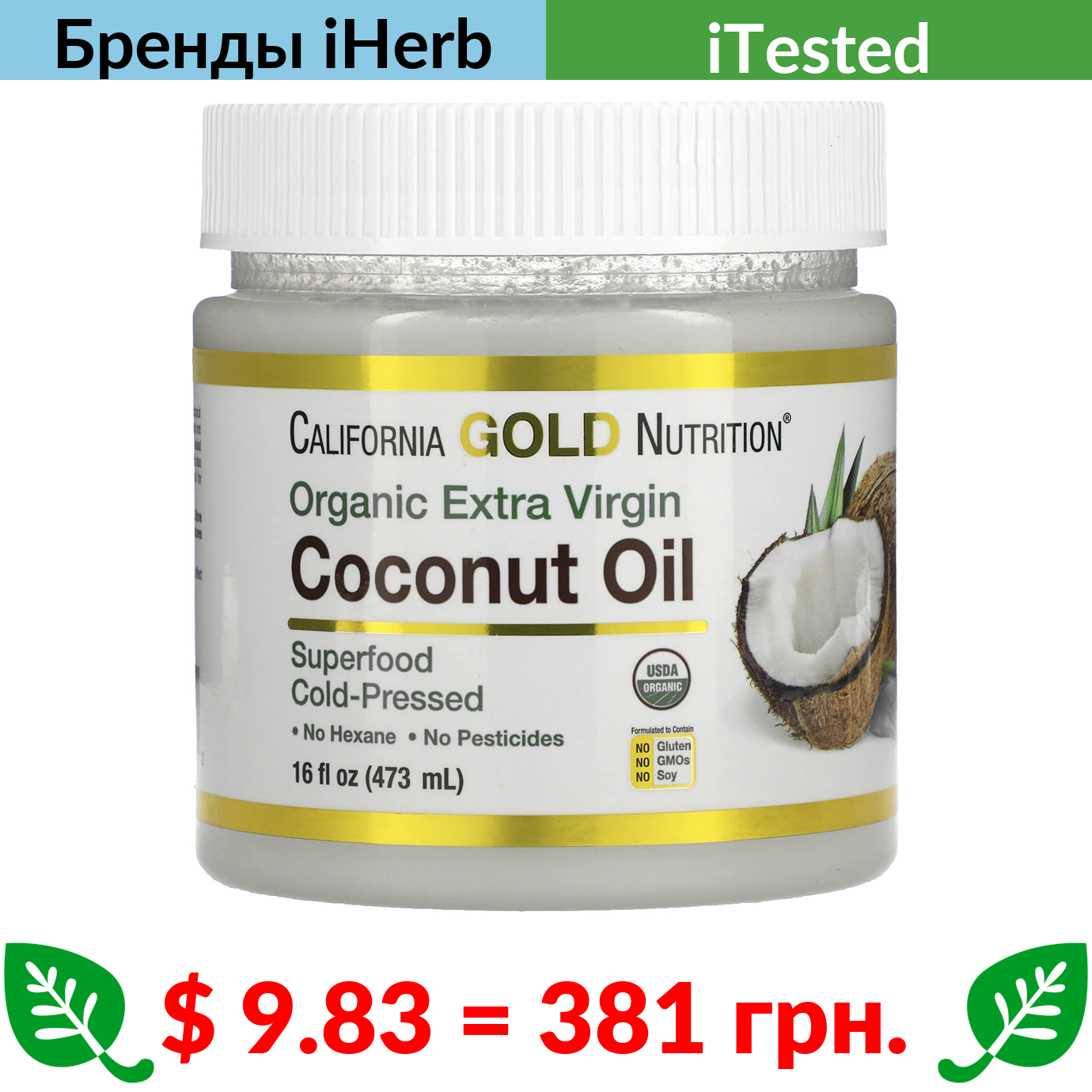 $ 9.83 = 381 грн. California Gold Nutrition, SUPERFOODS, органическое нерафинированное кокосовое масло первого холодного отжима, 473 мл (16 жидк. унций)