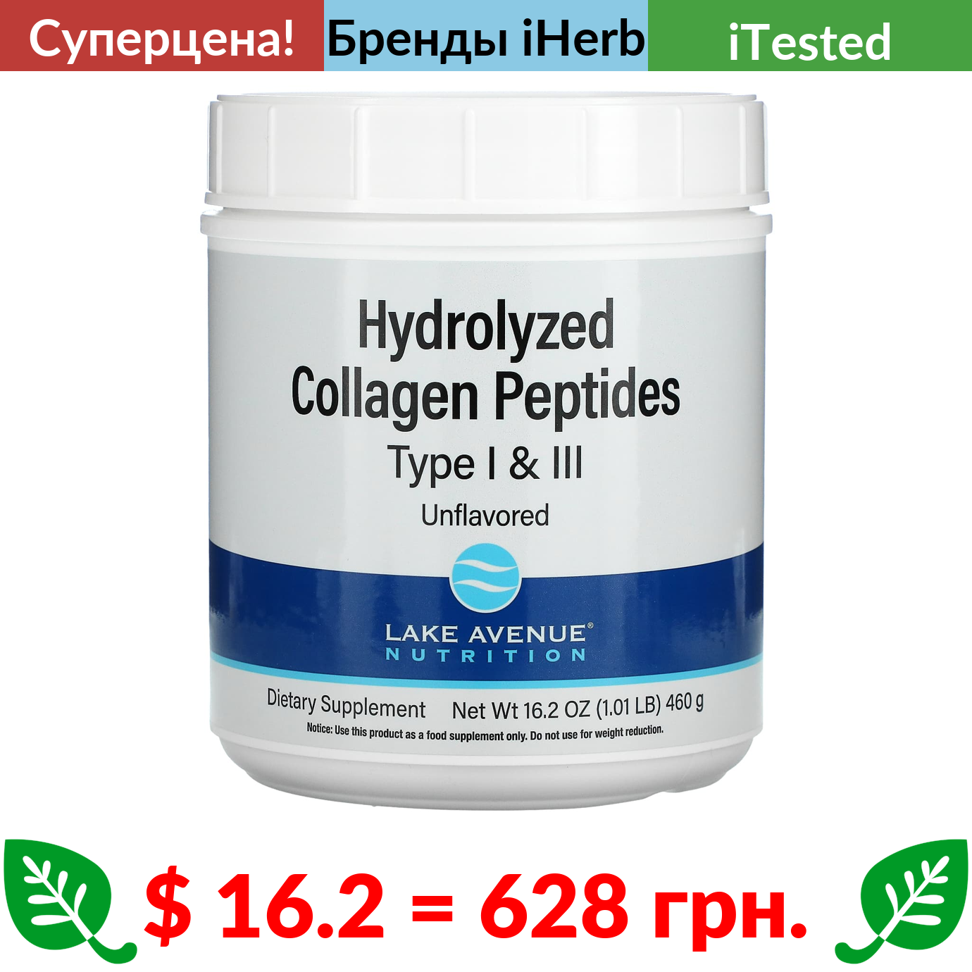 $ 16.2 = 628 грн. ???? cуперакція! ???? Lake Avenue Nutrition, гидролизованные пептиды коллагена типов I и III, с нейтральным вкусом, 460 г (1,01 фунта)