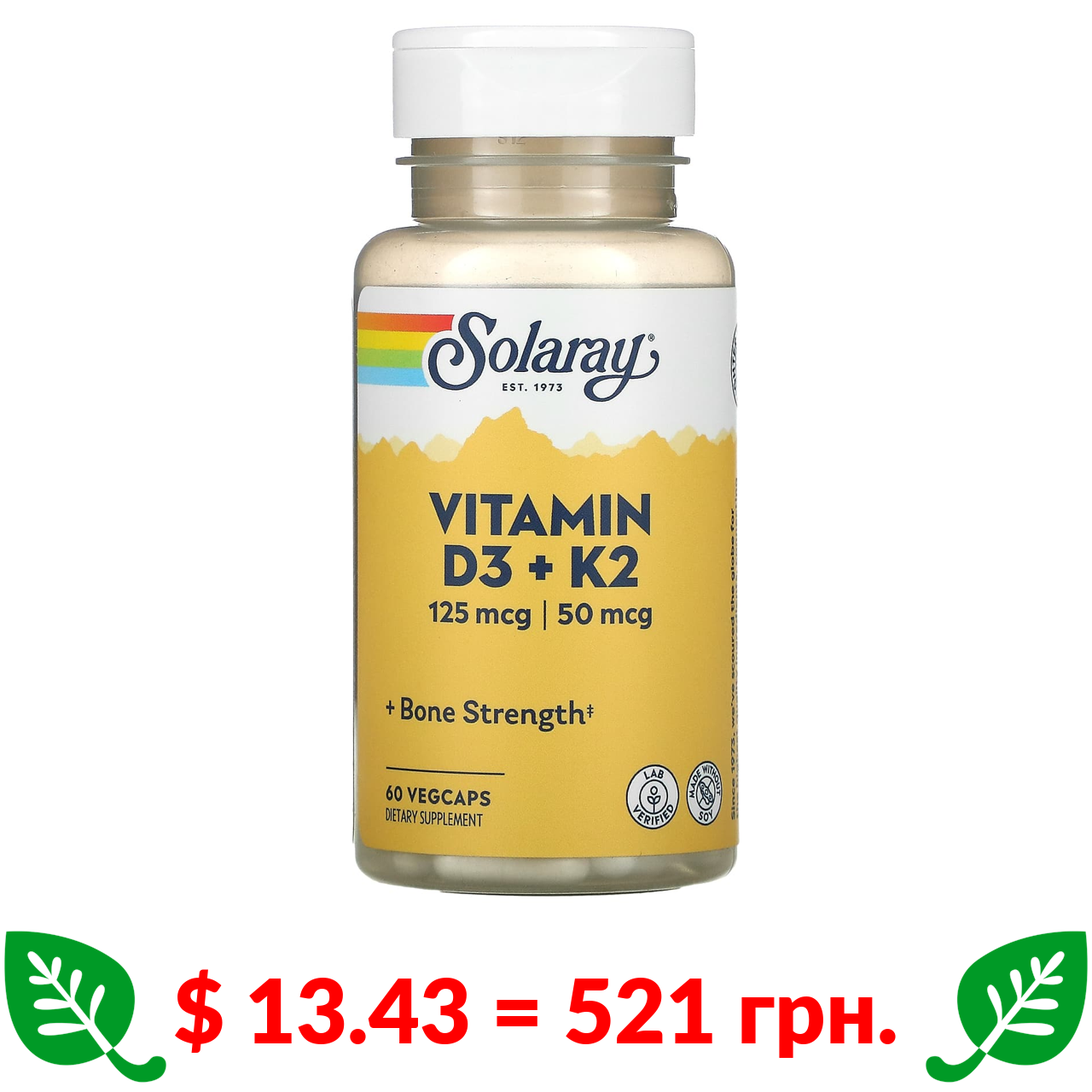 $ 13.43 = 521 грн. ????️ у кошику ????️ Соларай, витамины D3 и K2, без сои, 60 растительных капсул