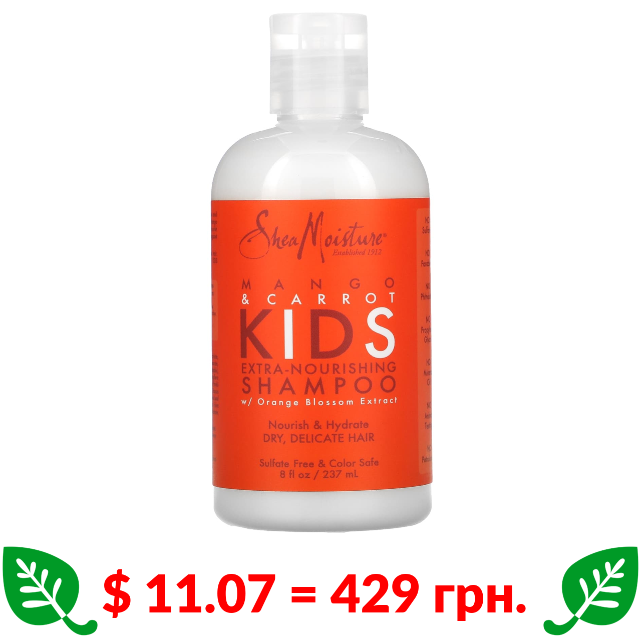 $ 11.07 = 429 грн. SheaMoisture, экстра-питательный шампунь для детей, манго и морковь, 237 мл (8 жидк. унций)