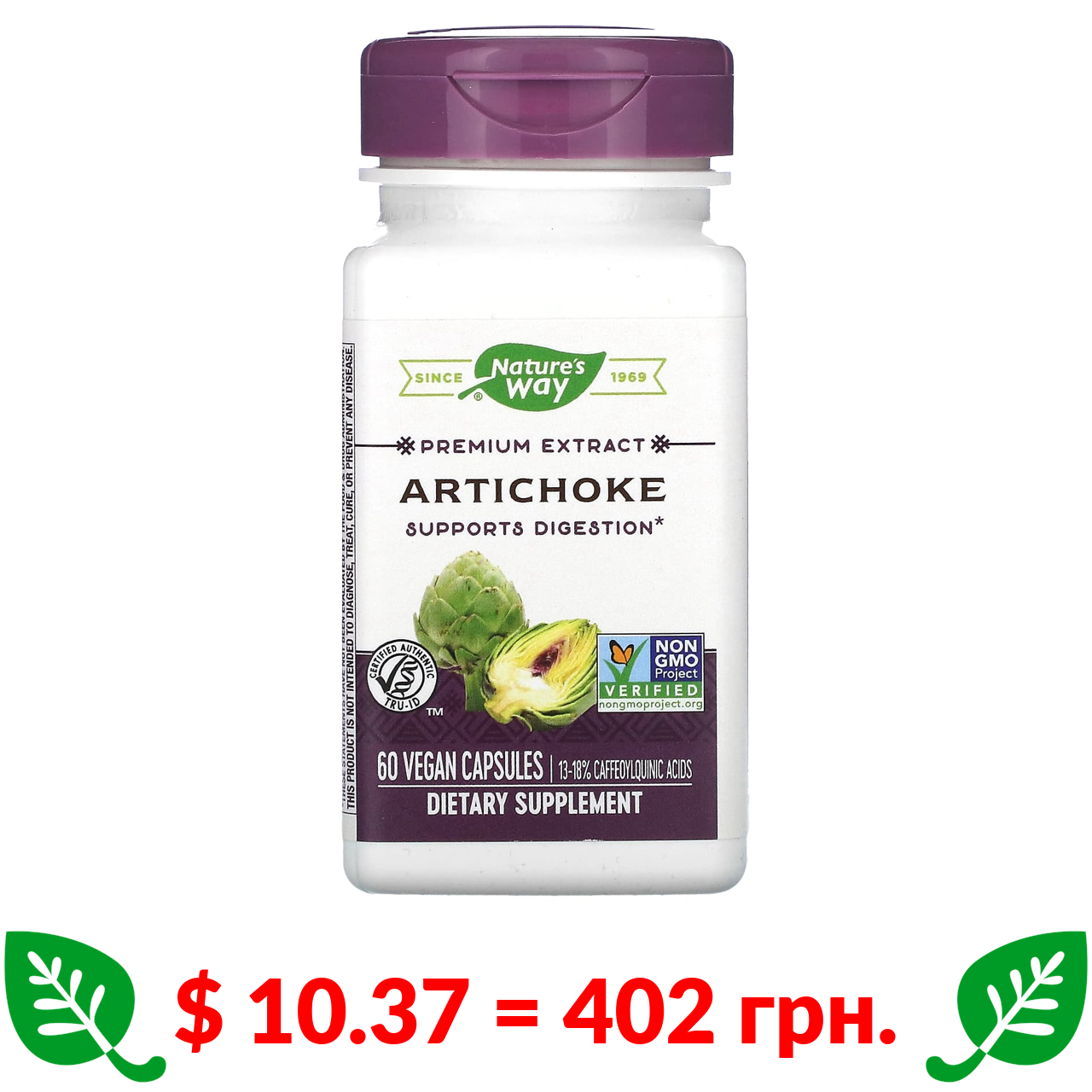 $ 10.37 = 402 грн. Натурес Вэй, артишок, 60 веганских капсул