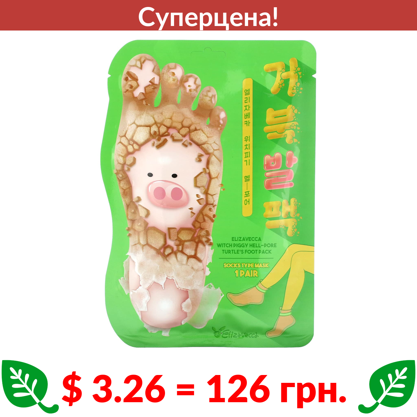 $ 3.26 = 126 грн. ???? cуперакція! ???? Elizavecca, Socks Type Mask, Witch Piggy Hell-Pore Turtle’s Foot Pack, 1 пара