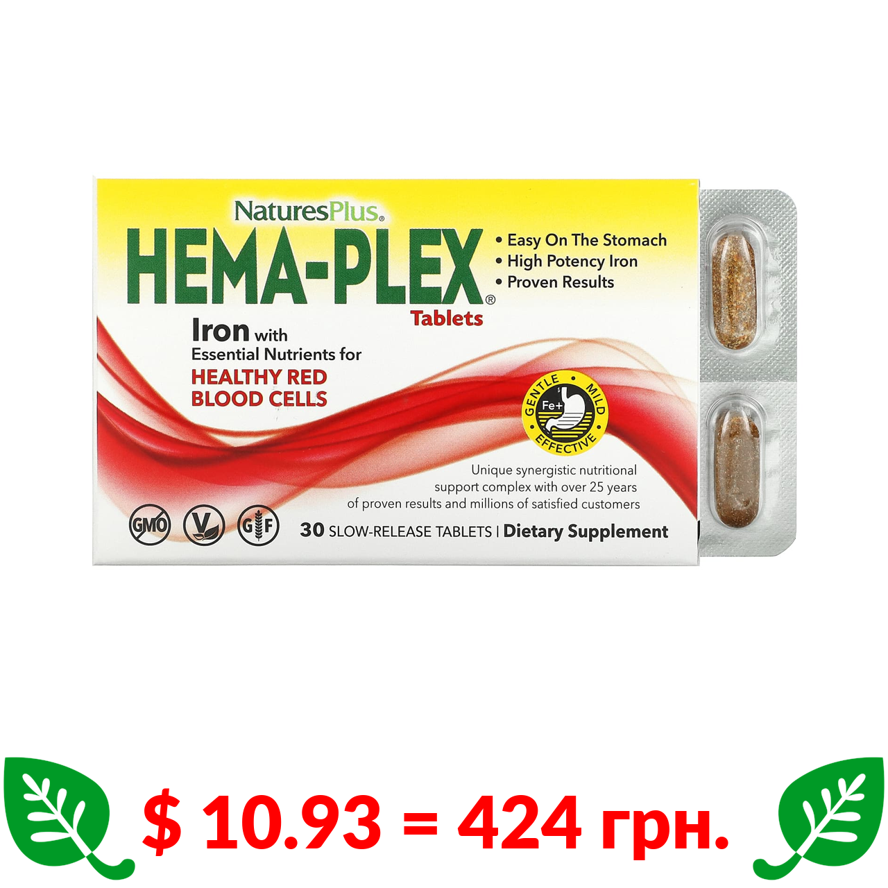 $ 10.93 = 424 грн. NaturesPlus, Hema-Plex, 30 таблеток с длительным высвобождением