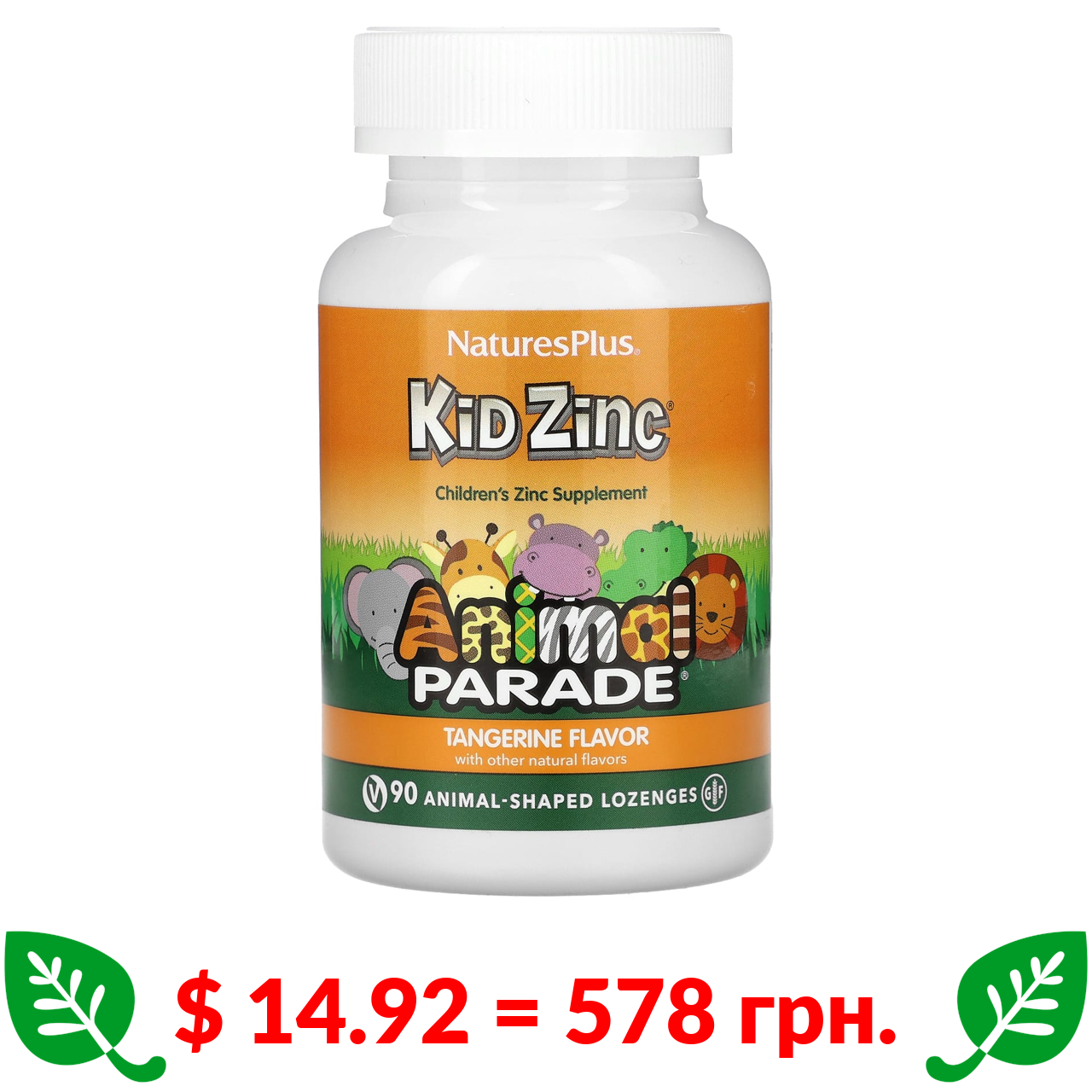 $ 14.92 = 578 грн. NaturesPlus, Source of Life, Animal Parade, Kid Zinc, пастилки с цинком для детей, натуральный вкус мандарина, 90 пастилок в форме животных