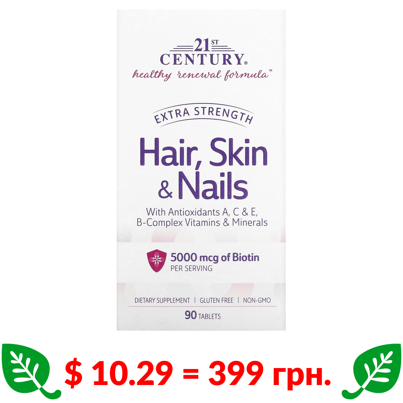 $ 10.29 = 399 грн. 21st Century, добавка для волос, кожи и ногтей, повышенная сила действия, 90 таблеток