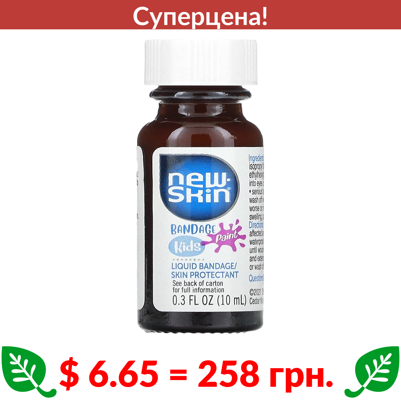 $ 6.65 = 258 грн. ???? cуперакція! ???? New Skin, Kids, Bandage Paint, жидкая повязка / средство для защиты кожи, фиолетовый, 10 мл (0,3 жидк. Унции)