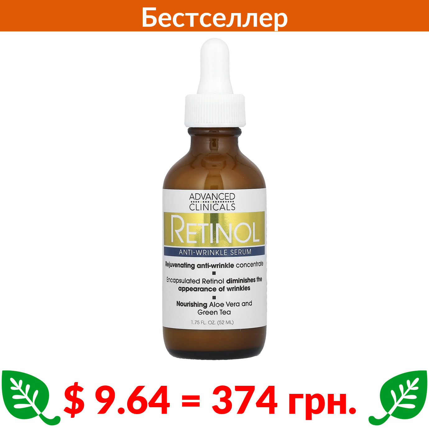 $ 9.64 = 374 грн. Advanced Clinicals, сыворотка с ретинолом, против морщин, 52 мл (1,75 жидк. унции)