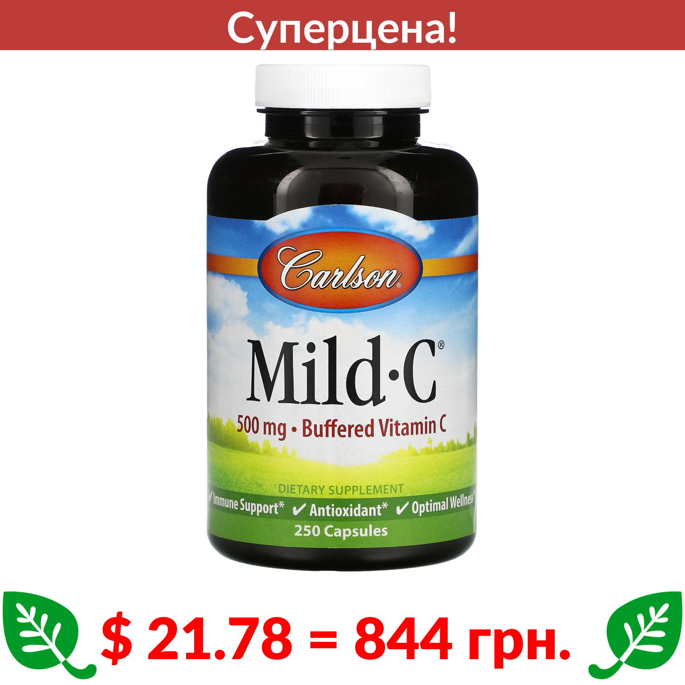 $ 21.78 = 844 грн. ???? cуперакція! ???? Carlson, Mild-C, витамин C деликатного действия, 500 мг, 250 капсул