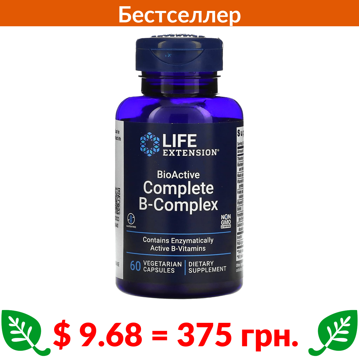 $ 9.68 = 375 грн. ????️ у кошику ????️ Life Extension, полный биоактивный комплекс витаминов группы B, 60 вегетарианских капсул