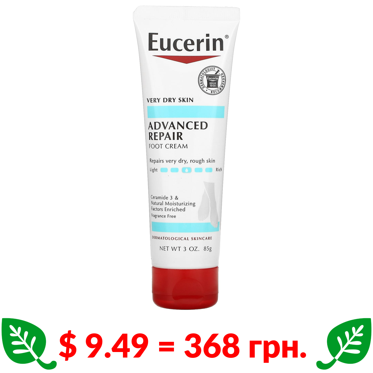 $ 9.49 = 368 грн. Eucerin, усовершенствованный восстанавливающий крем для ног, без запаха, 85 г (3 унции)