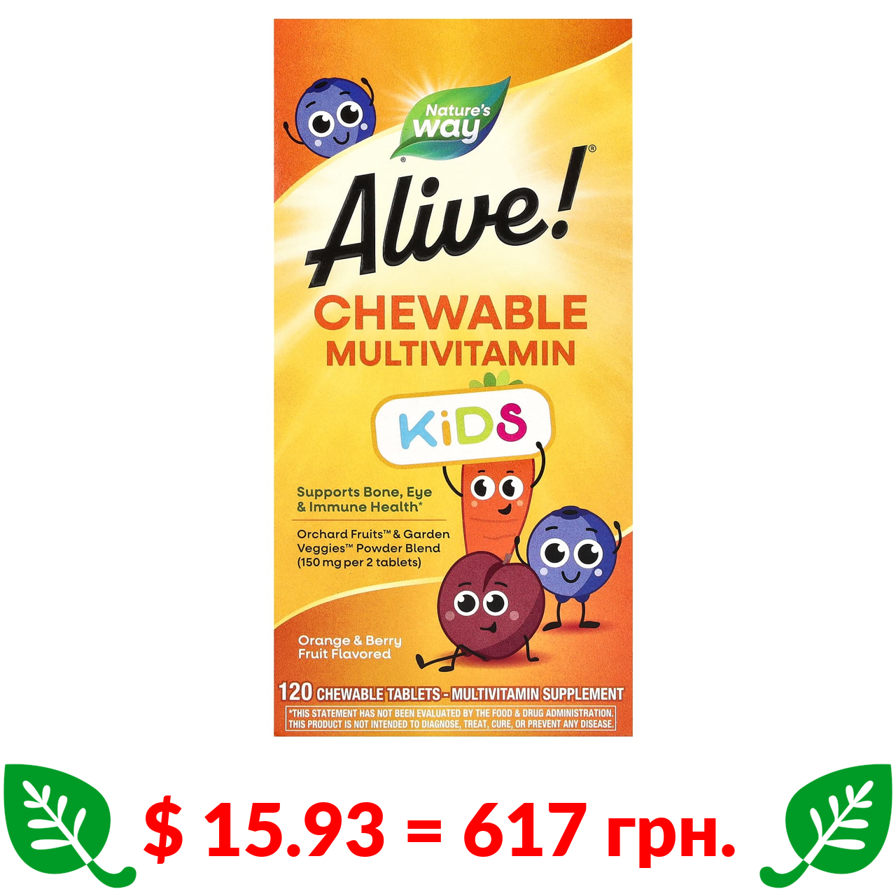 $ 15.93 = 617 грн. Натурес Вэй, Alive!, мультивитаминная добавка для детей, со вкусом апельсина и ягод, 120 жевательных таблеток