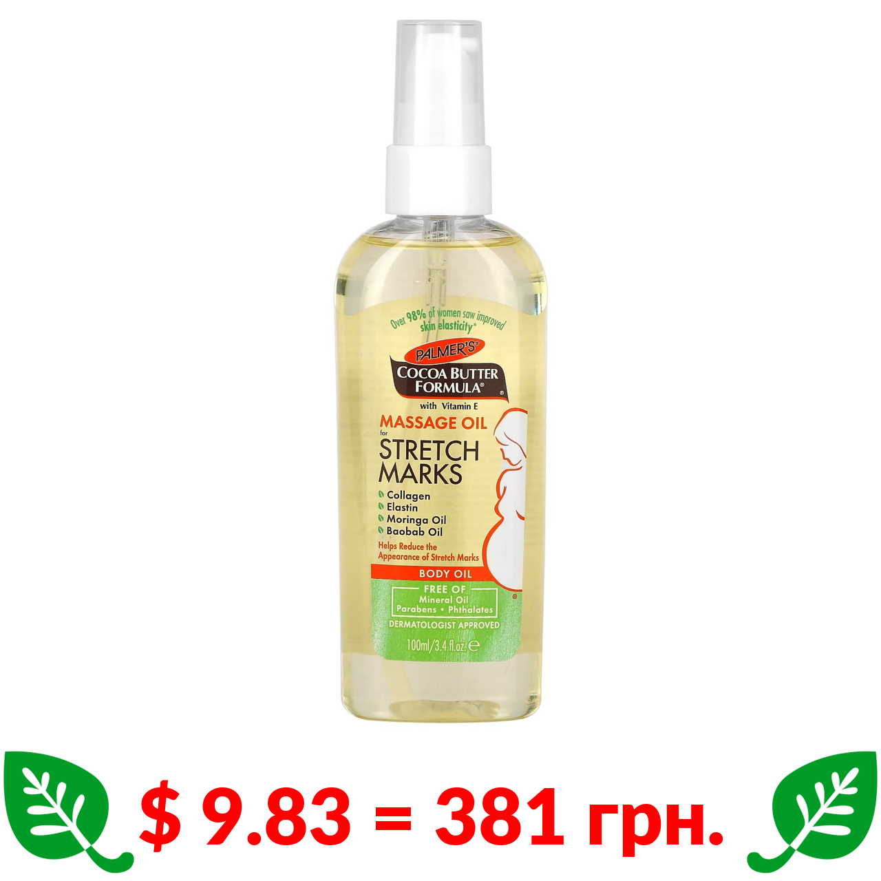 $ 9.83 = 381 грн. Палмерс, Cocoa Butter Formula, массажное масло против растяжек, 100 мл (3,4 жидк. унции)