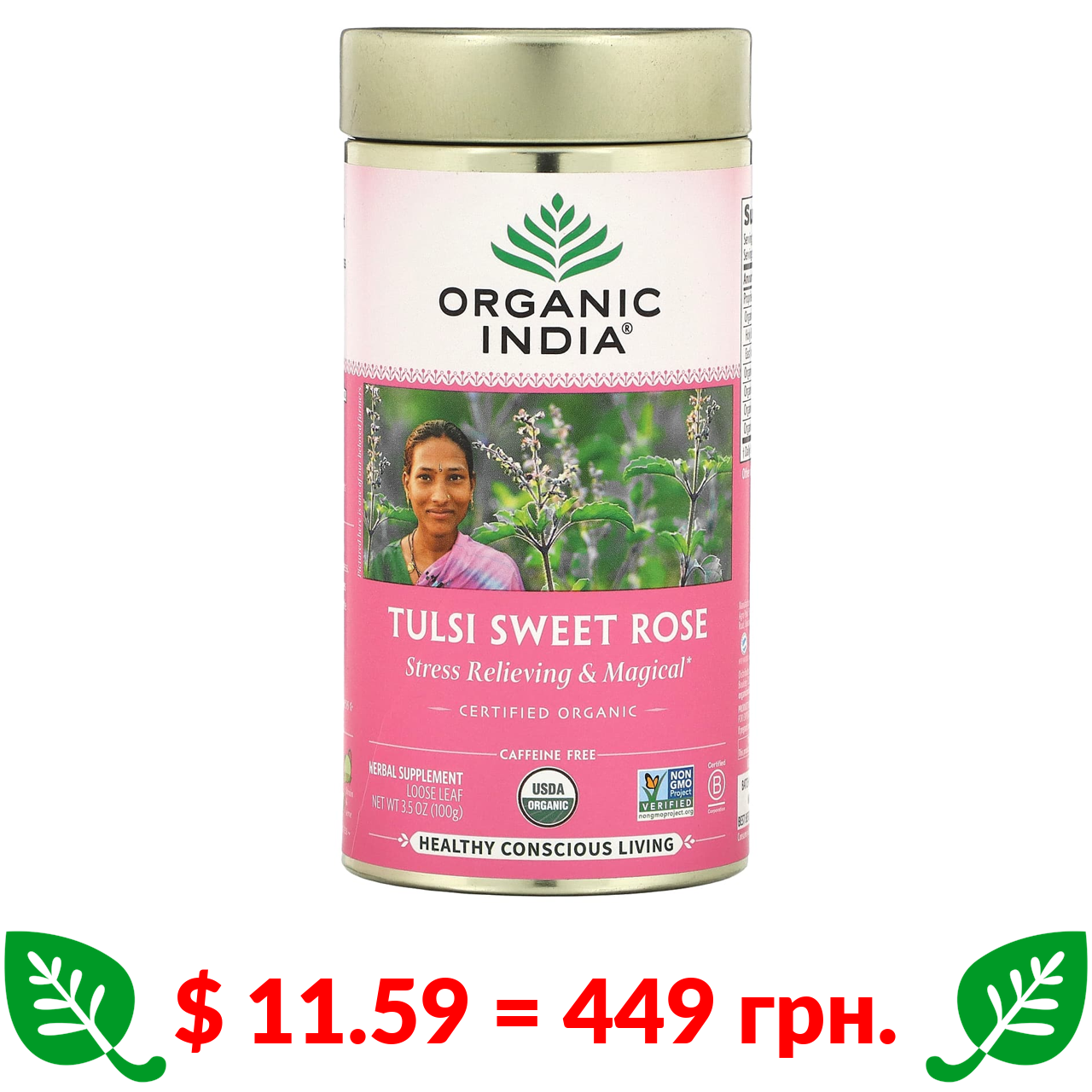 $ 11.59 = 449 грн. Органик Индиа, тулси и сладкая роза, без кофеина, 100 г (3,5 унции)
