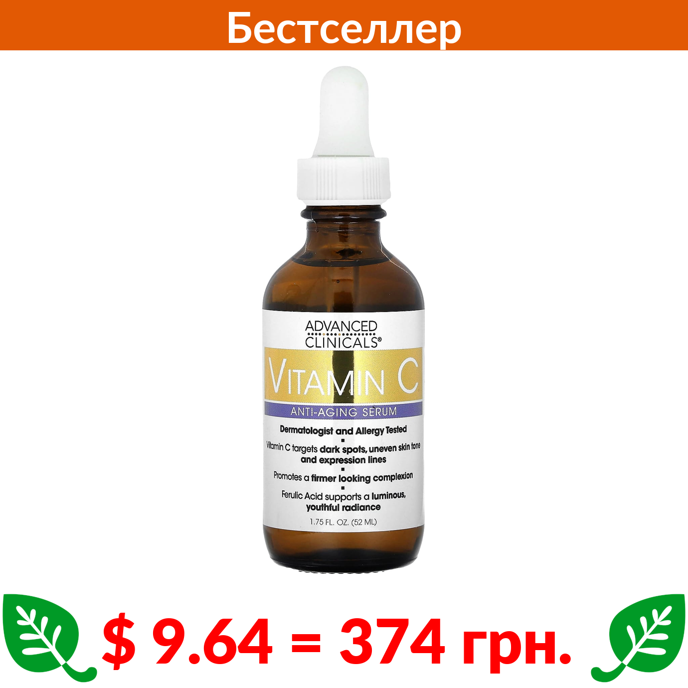 $ 9.64 = 374 грн. Advanced Clinicals, антивозрастная сыворотка с витамином C, 52 мл, (1,75 жидк. унции)