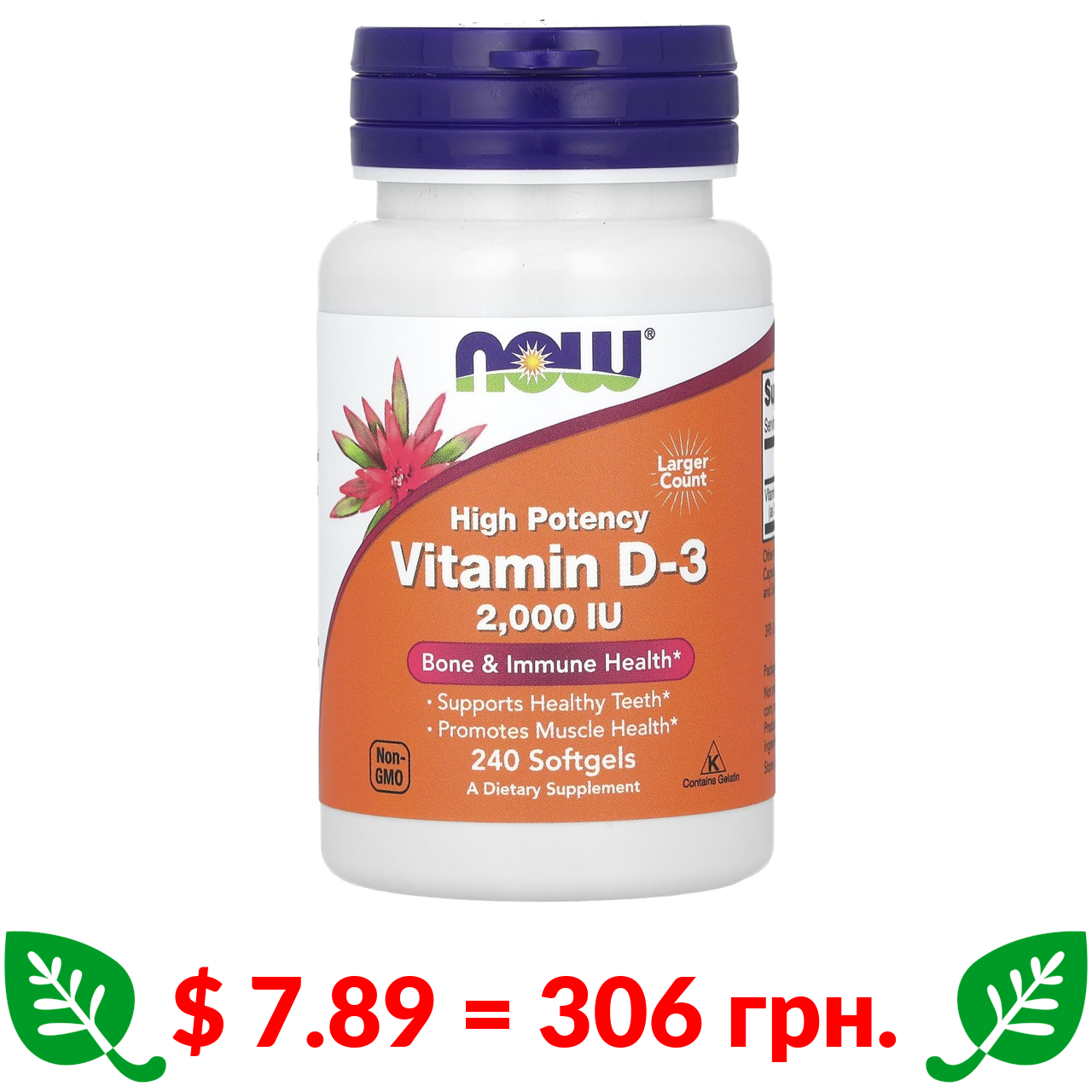 $ 7.89 = 306 грн. ????️ у кошику ????️ Now Foods, витамин D3, высокоактивный, 2000 МЕ, 240 капсул