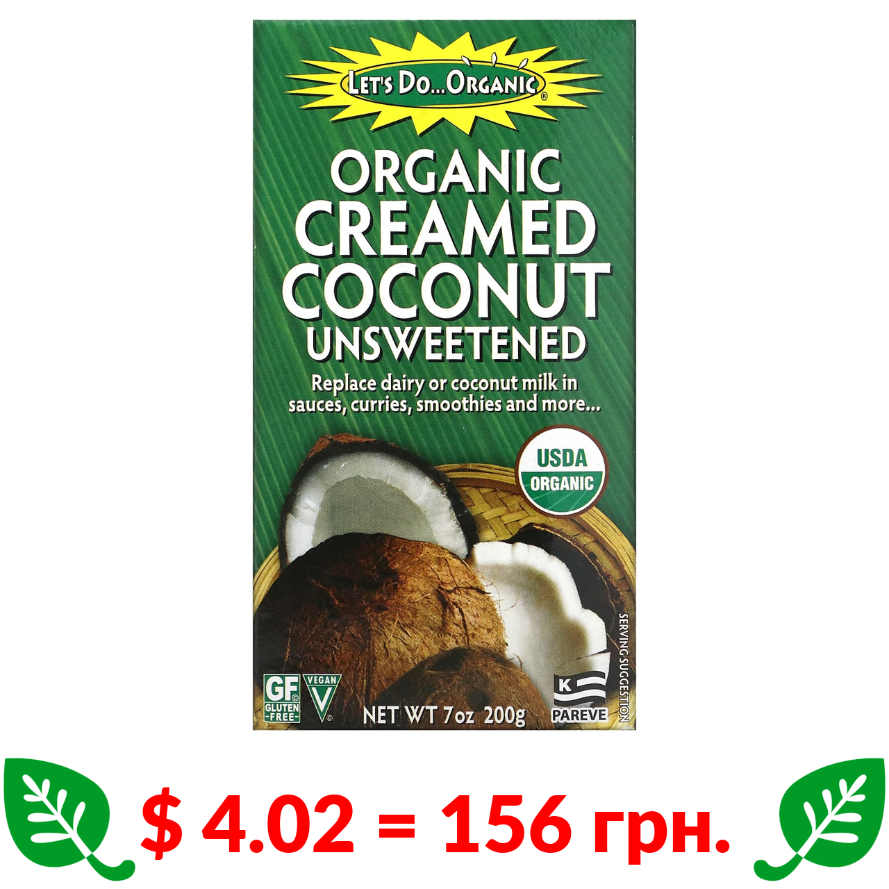 $ 4.02 = 156 грн. Эдвард энд Санс, Let’s Do Organic, органический кокос со сливками, без сахара, 200 г (7 унций)