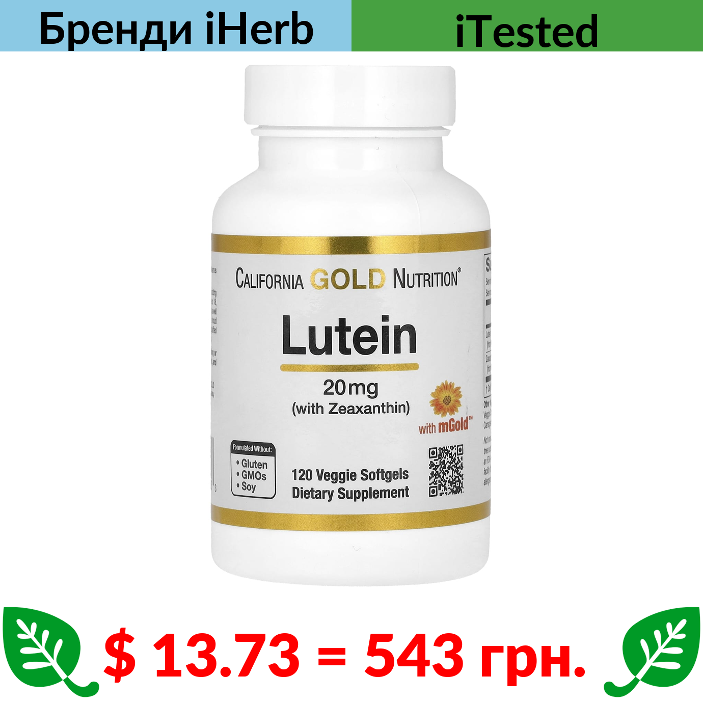 $ 13.73 = 543 грн. ????️ у кошику ????️ California Gold Nutrition, лютеїн із зеаксантином, 20 мг, 120 вегетаріанських капсул