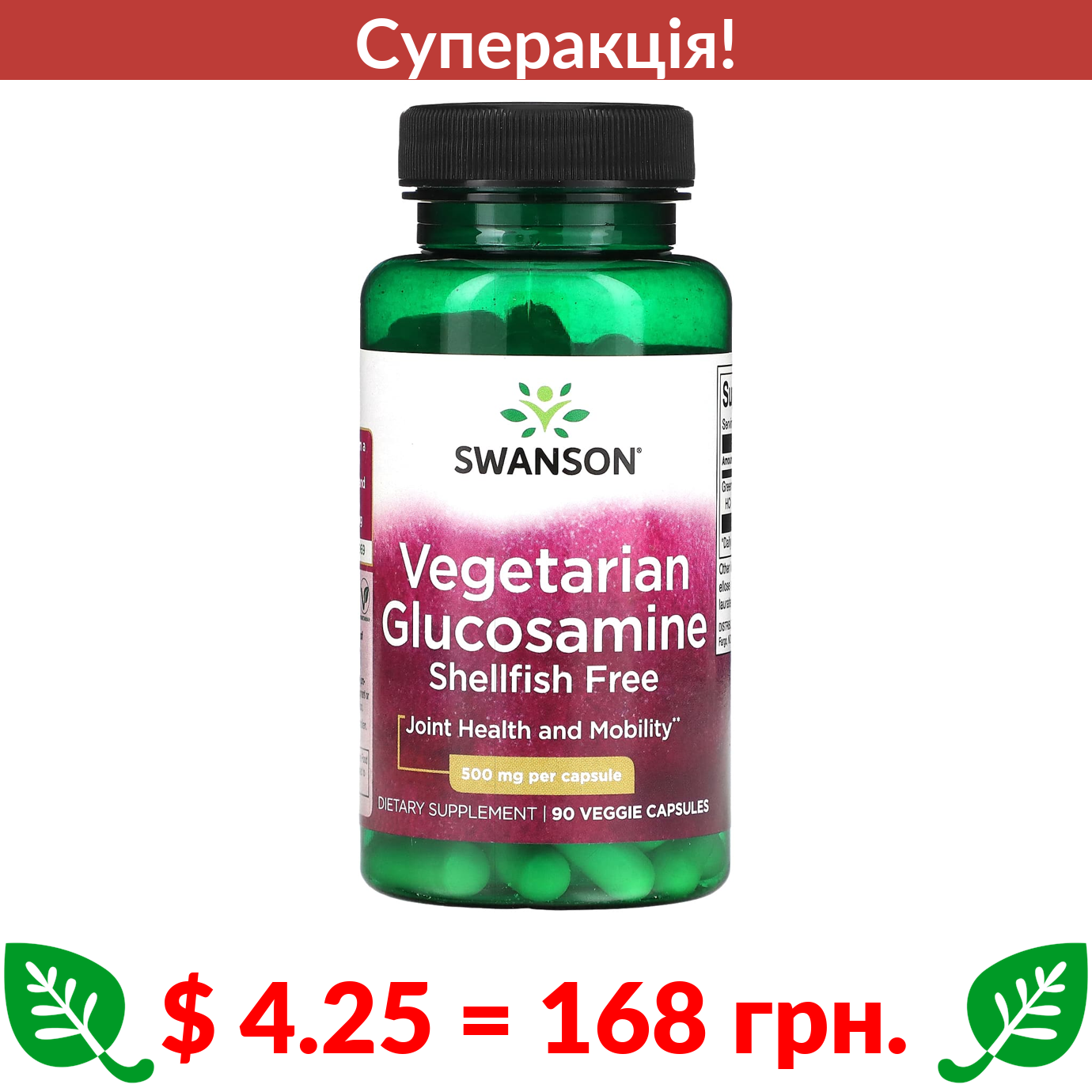 $ 4.25 = 168 грн. ???? cуперакція! ???? Swanson, Vegetarian Glucosamine, 500 mg, 90 Veggie Capsules