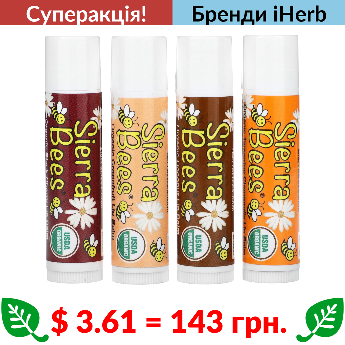 $ 3.61 = 143 грн. ???? cуперакція! ???? Sierra Bees, набір органічних бальзамів для губ, 4 штуки по 4,25 г (0,15 унції)