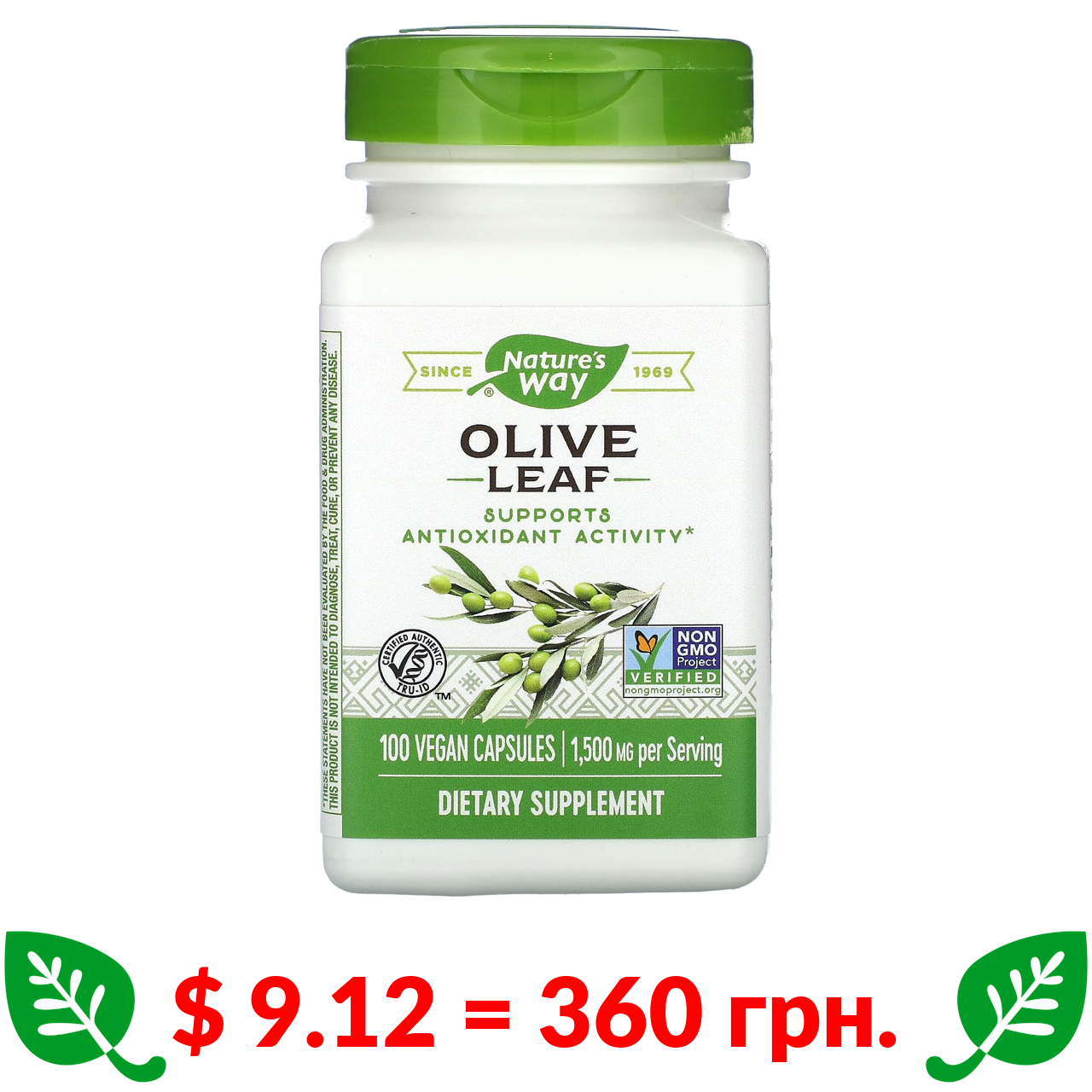 $ 9.12 = 360 грн. ????️ у кошику ????️ Nature’s Way, листя маслини, 1500 мг, 100 веганських капсул (500 мг у капсулі)