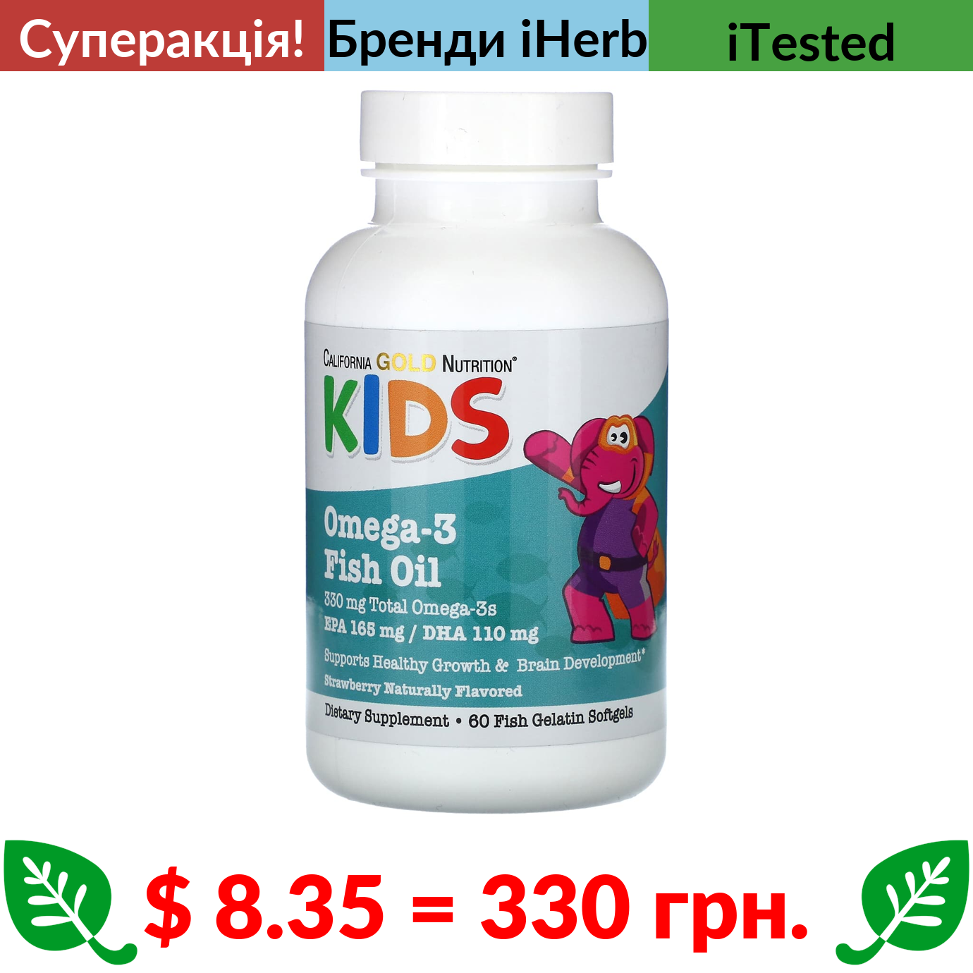 $ 8.35 = 330 грн. ???? cуперакція! ???? California Gold Nutrition, риб’ячий жир з омега-3 для дітей, з натуральним полуничним смаком, 60 капсул із риб’ячого желатину